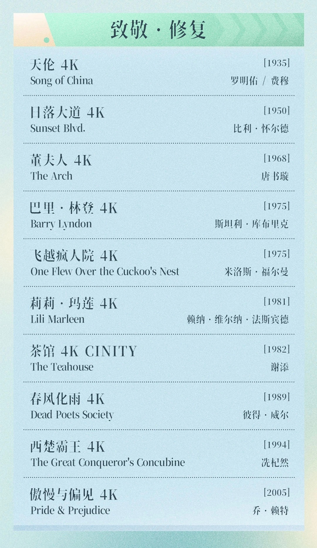 在今年的致敬·修复单元中,共有8部4K修复版本的影片放映,除了《日落大道》《飞越疯人院》《死亡诗社》(官方片单中更名为《春风化雨》)等经典,还有几部值得一提的稀有放映。