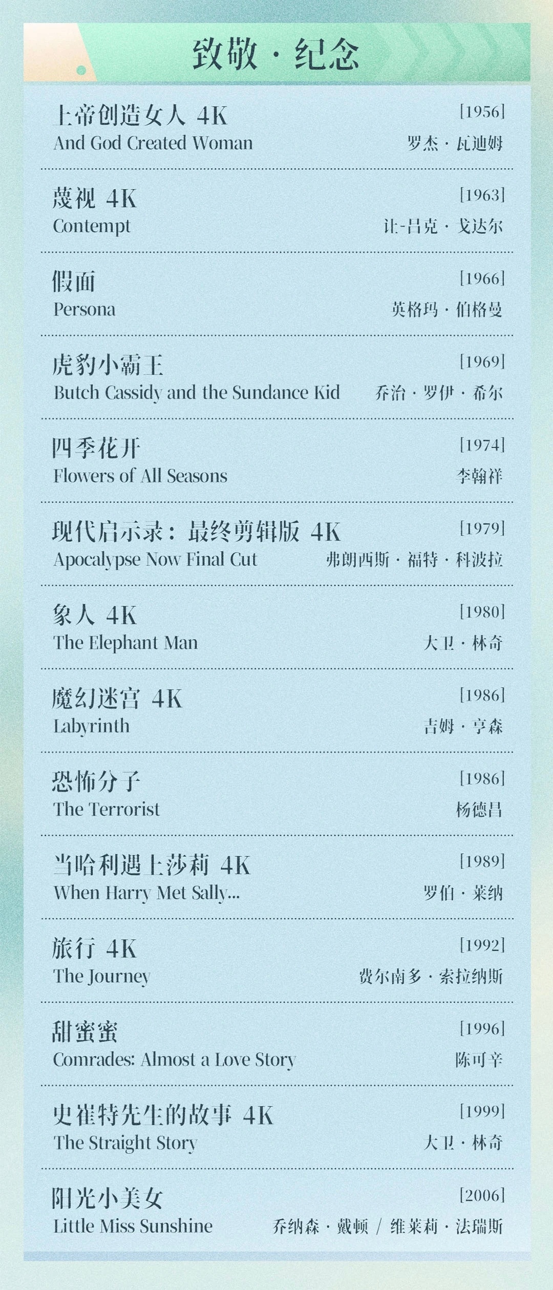 本次致敬·纪念单元包含11部影史名作,其中有戈达尔的《蔑视》、大卫·林奇《象人》《史崔特先生的故事》、阿根廷名导费尔南多·索拉纳斯《旅行》等7部4K修复版本。