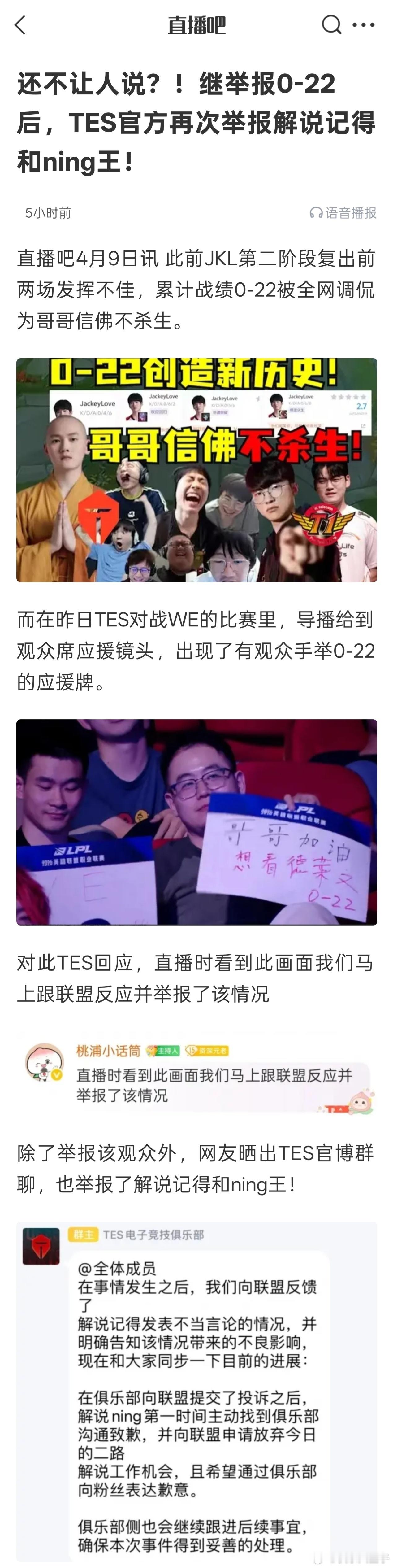 某吧做了一篇稿子,标题为《还不让人说?!继举报0-22后,TES官方再次举报解说记得和ning王》,并在稿件中附上了图二作为TES举报解说记得和宁王的佐证。
