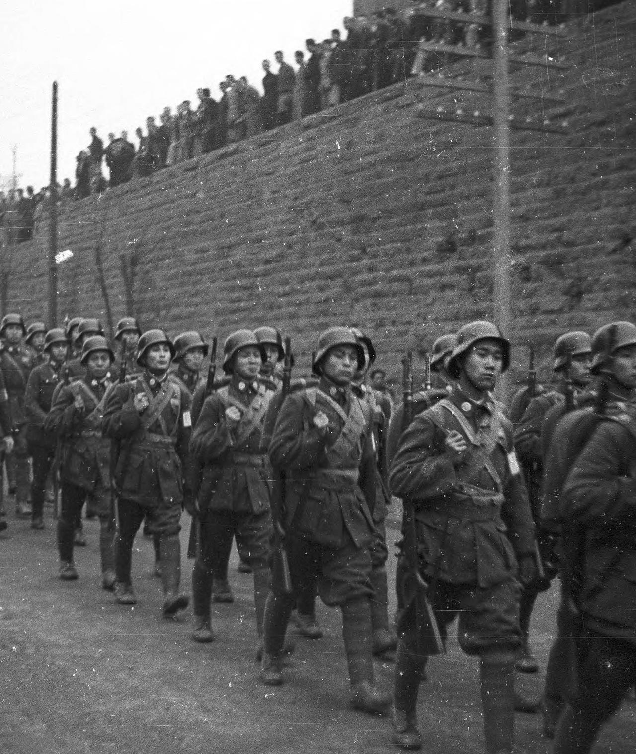 这是摄影师在战争中拍摄到的目前为止最清晰的一张中国德械师照片。此时此刻的他们装备整齐,昂首挺胸走在大街上,路边到处都是围观的人民群众,估计大家都没有见过装备如此精良的中国军队。从这些士兵的脸上,我们可以判断出此时此刻的他们士气正盛,他们应该是中国最厉害的部队,没有之一。