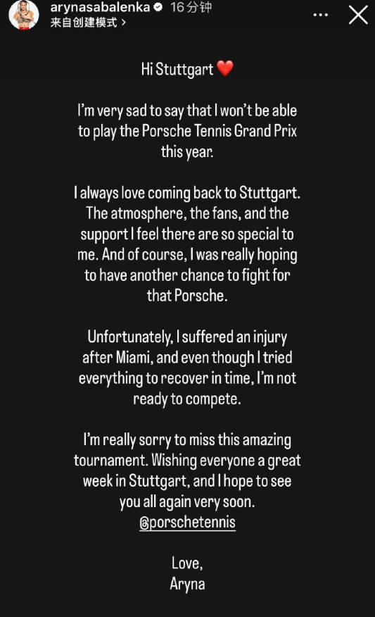 萨巴:“你好,斯图加特:非常遗憾地告诉大家,我将无法参加今年的保时捷网球大奖赛。