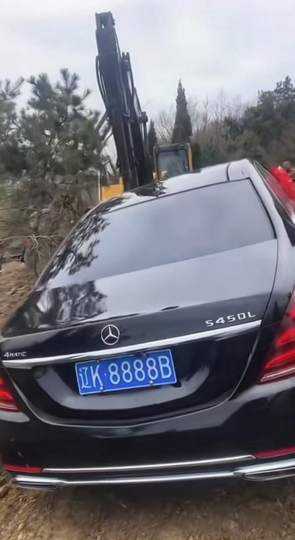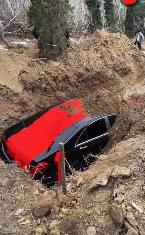 确实,以前听说过烧纸车、纸别墅的,那都是纸糊的,图个心理安慰。这回倒好,直接来真的。一辆实实在在的奔驰S450L,落地怎么也得一百二三十万,就这么推进土里,永远不见天日了