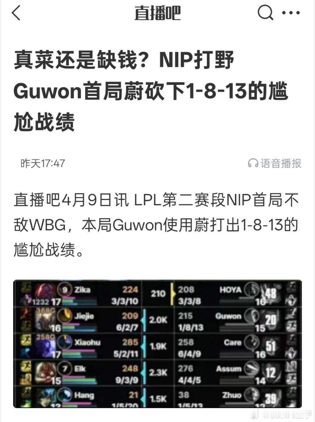 昨天NIP打野Guwon第一场打得不好,标题直接“真菜还是缺钱”,多亏NIP后面比赛赢了。