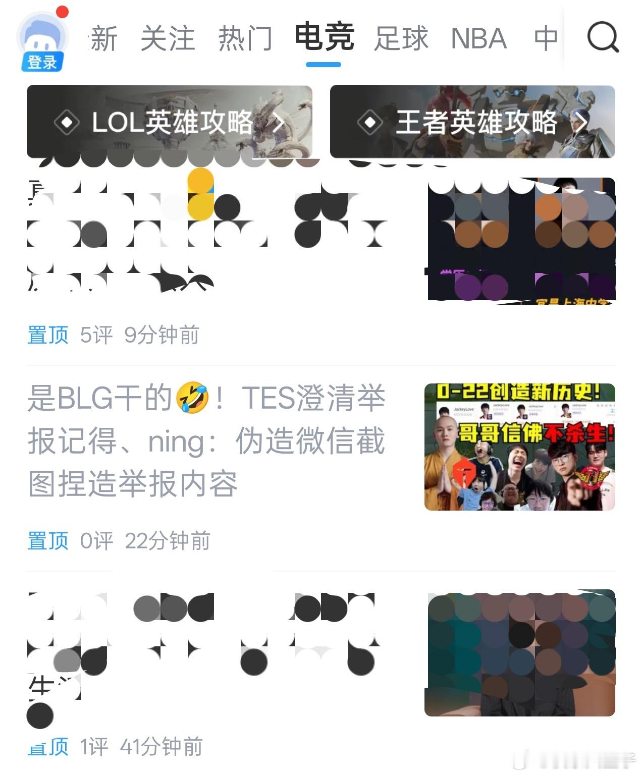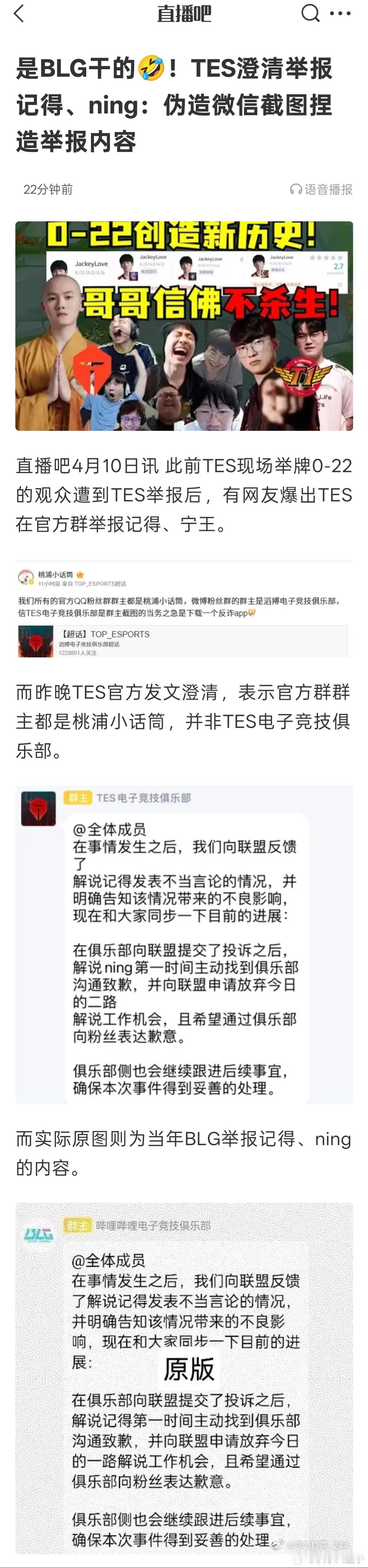 伪造截图嘲讽TES的稿子,在TES辟谣之后,摇身一变说是BLG干的,直接置顶在APP里