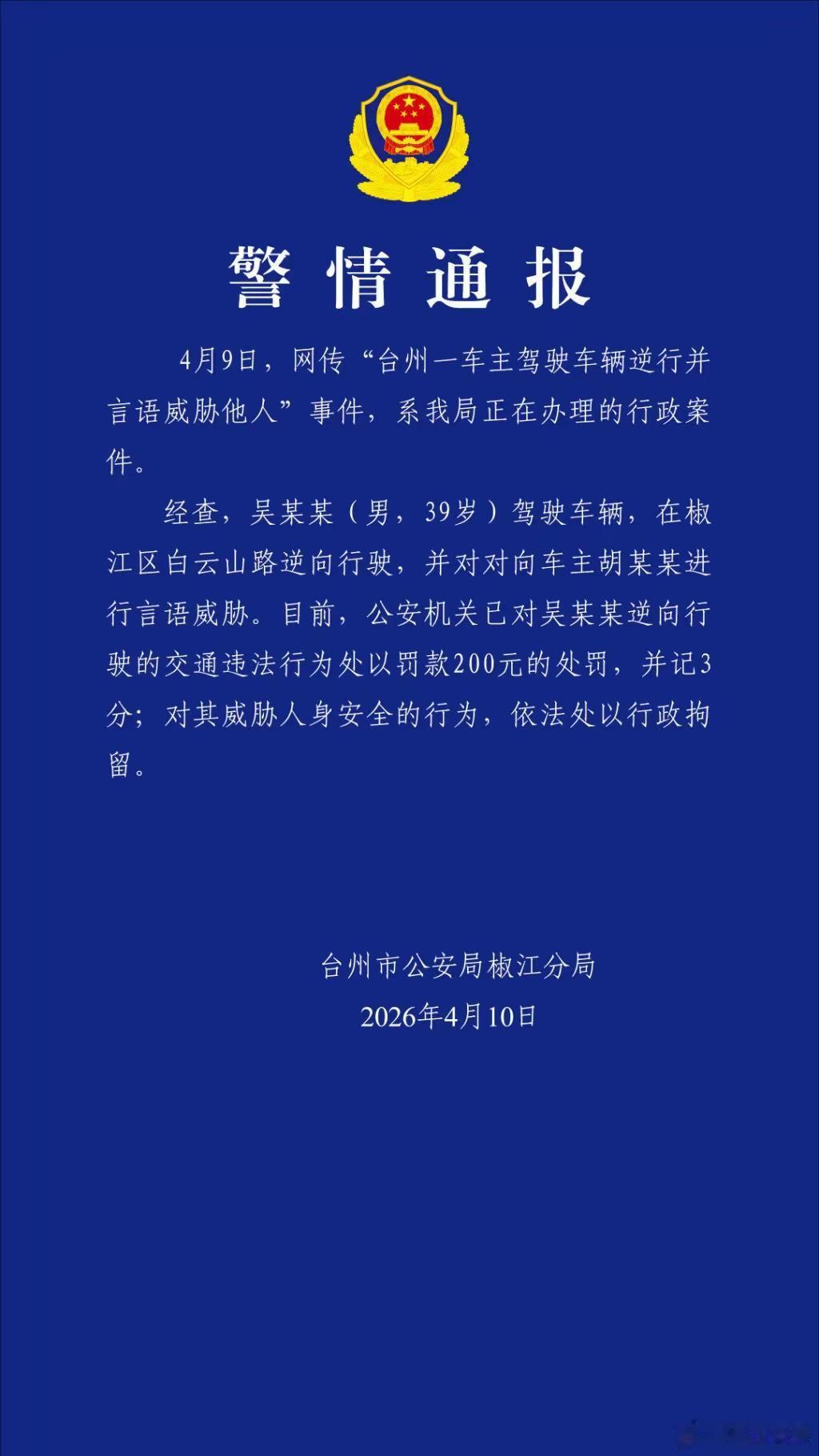 事件曝光后,台州市公安局椒江分局火速通报:对其逆行违法行为罚款200元、记3分,同时对威胁人身安全的行为处以行政拘留!