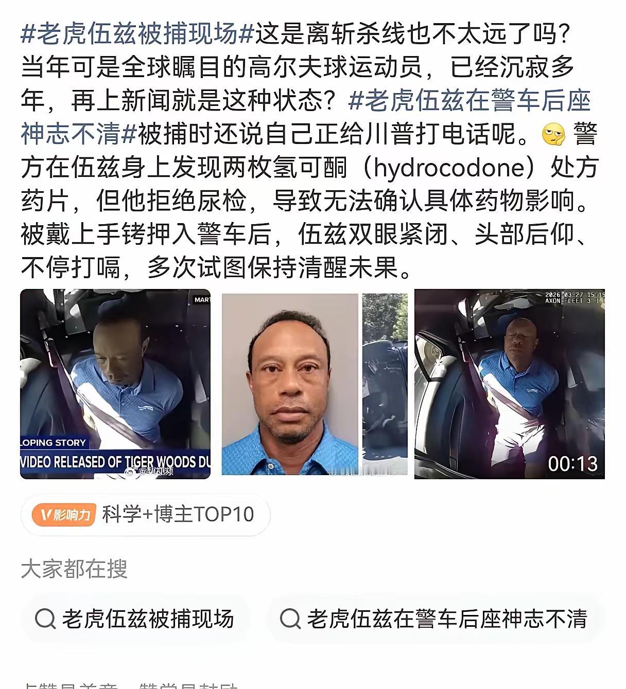 大名鼎鼎的老虎伍兹因药驾失态被捕,想不到吧?