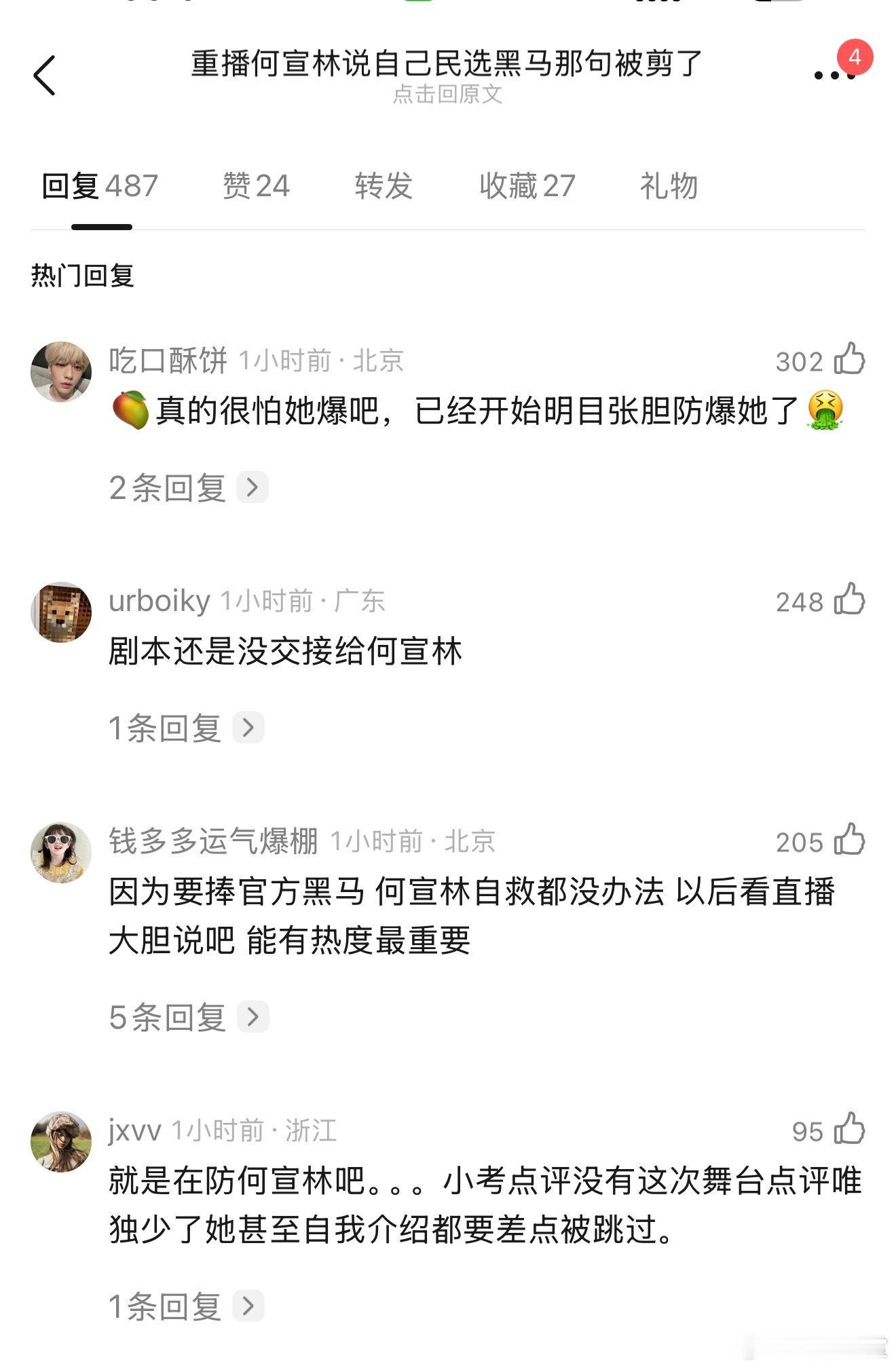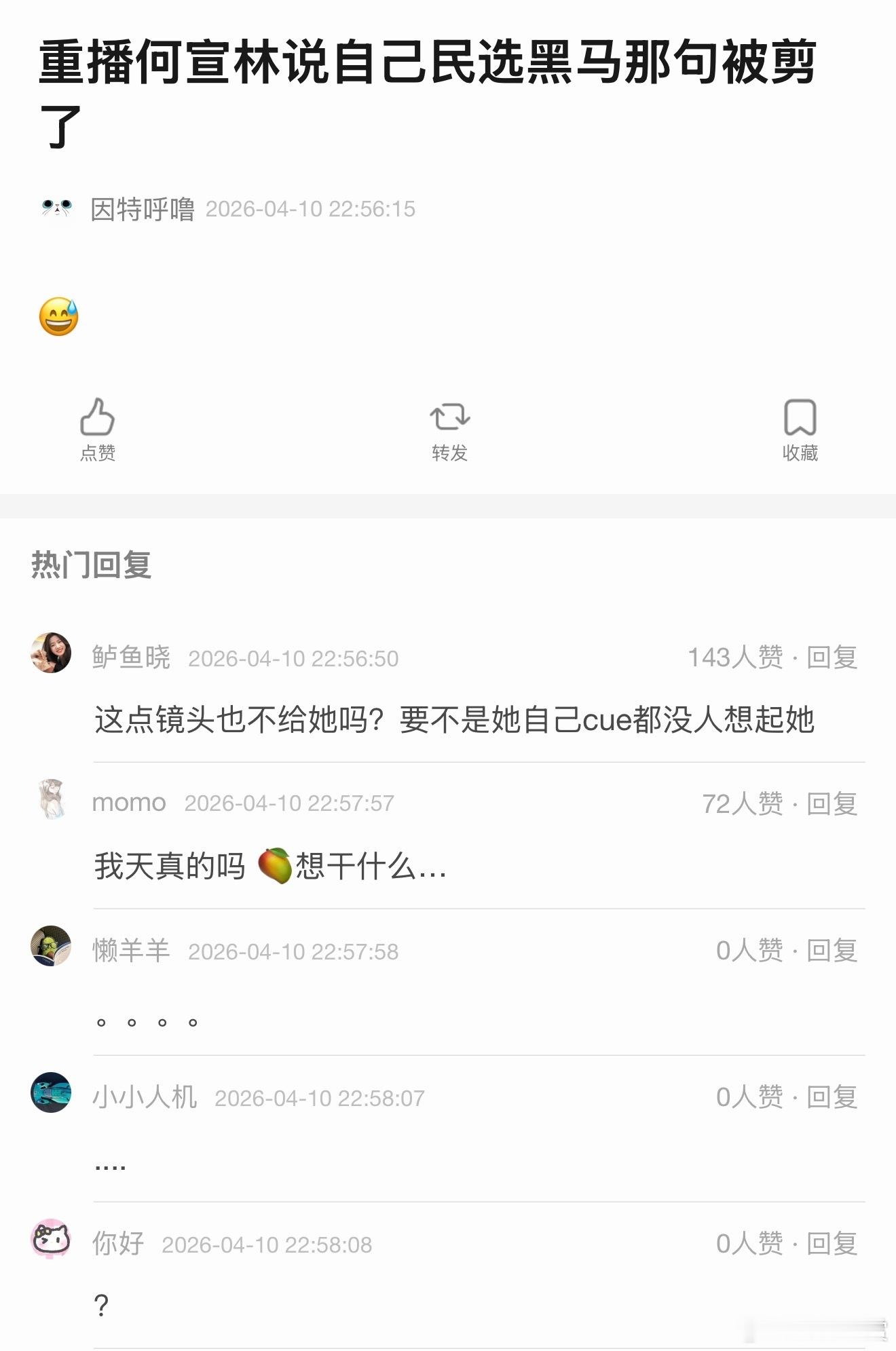 浪姐剪掉了何宣林民选黑马发言网友发现浪姐在重播里剪掉了何宣林民选黑马发言,这…为