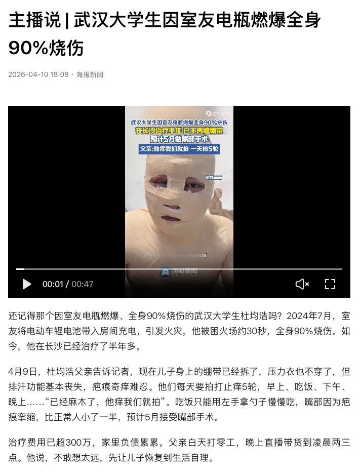 令人痛心!武汉,一名大三男生在出租屋睡觉,室友违规把电瓶车电池带进屋充电突然爆燃。男生被困火场仅仅 30秒,导致全身 90%严重烧伤。如今治疗半年多,父母倾家荡产甚至割皮救子,每天光拍打止痒就要 5轮。网友:这哪里是室友,简直是带了个定时炸弹,把人家一辈子都毁了!