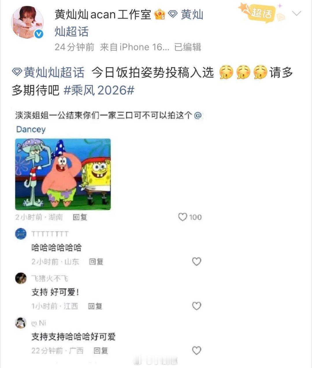饭撒姿势是投稿来的,太宠了们真蛋黄!!!哎哟这个家有灿灿是我的福气!!!甚至连衣服颜色都复刻到了呜呜呜😭😭⭐️曾沛慈|淡淡|黄灿灿🔸乘风2026