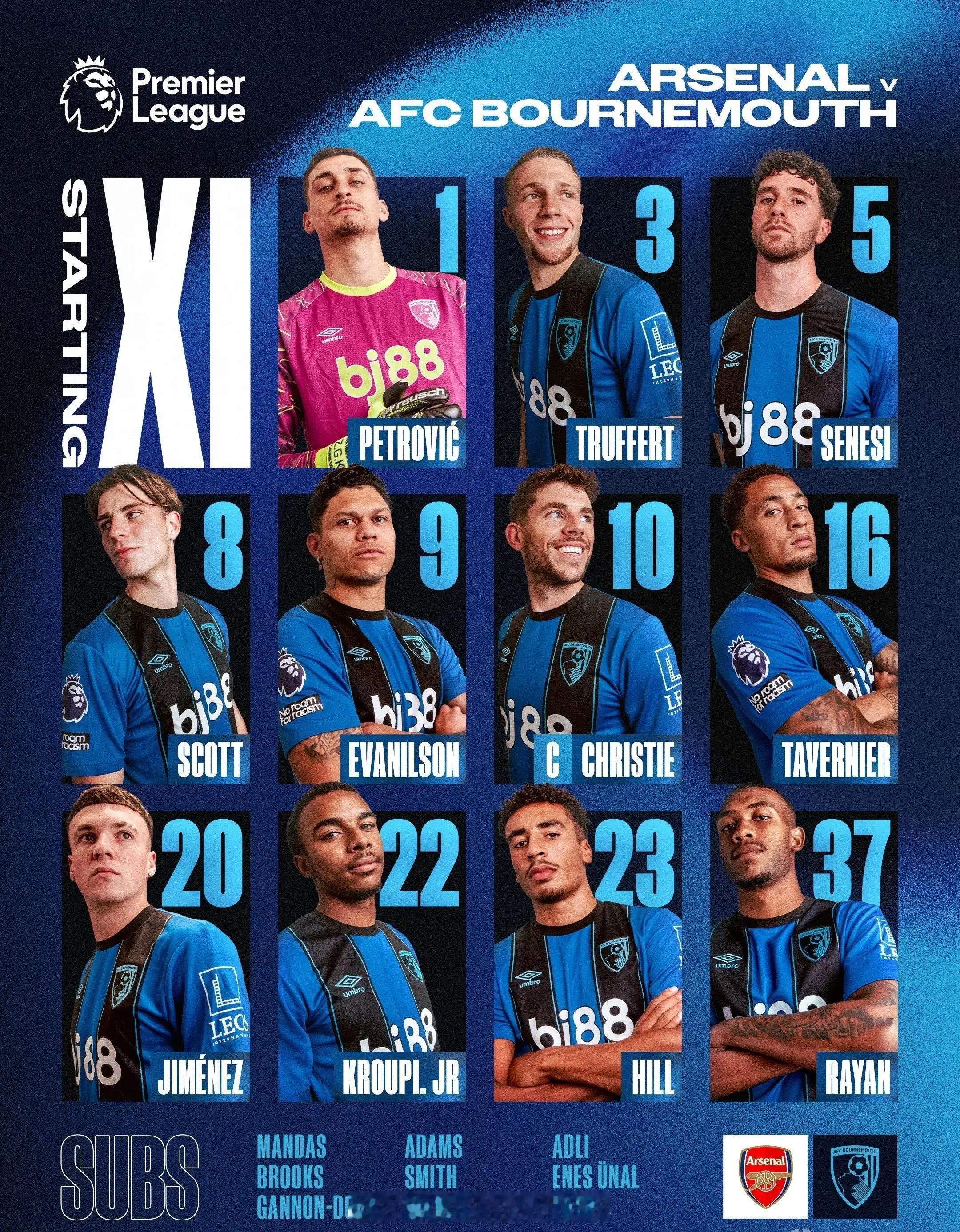 伯恩茅斯首发:1-彼得罗维奇、3-特吕费尔、5-塞内西、23-詹姆斯-希尔、20-阿莱士-希门尼斯、10-克里斯蒂、8-斯科特、22-克鲁皮、16-塔韦尼耶、37-拉扬、9-埃万尼尔松
