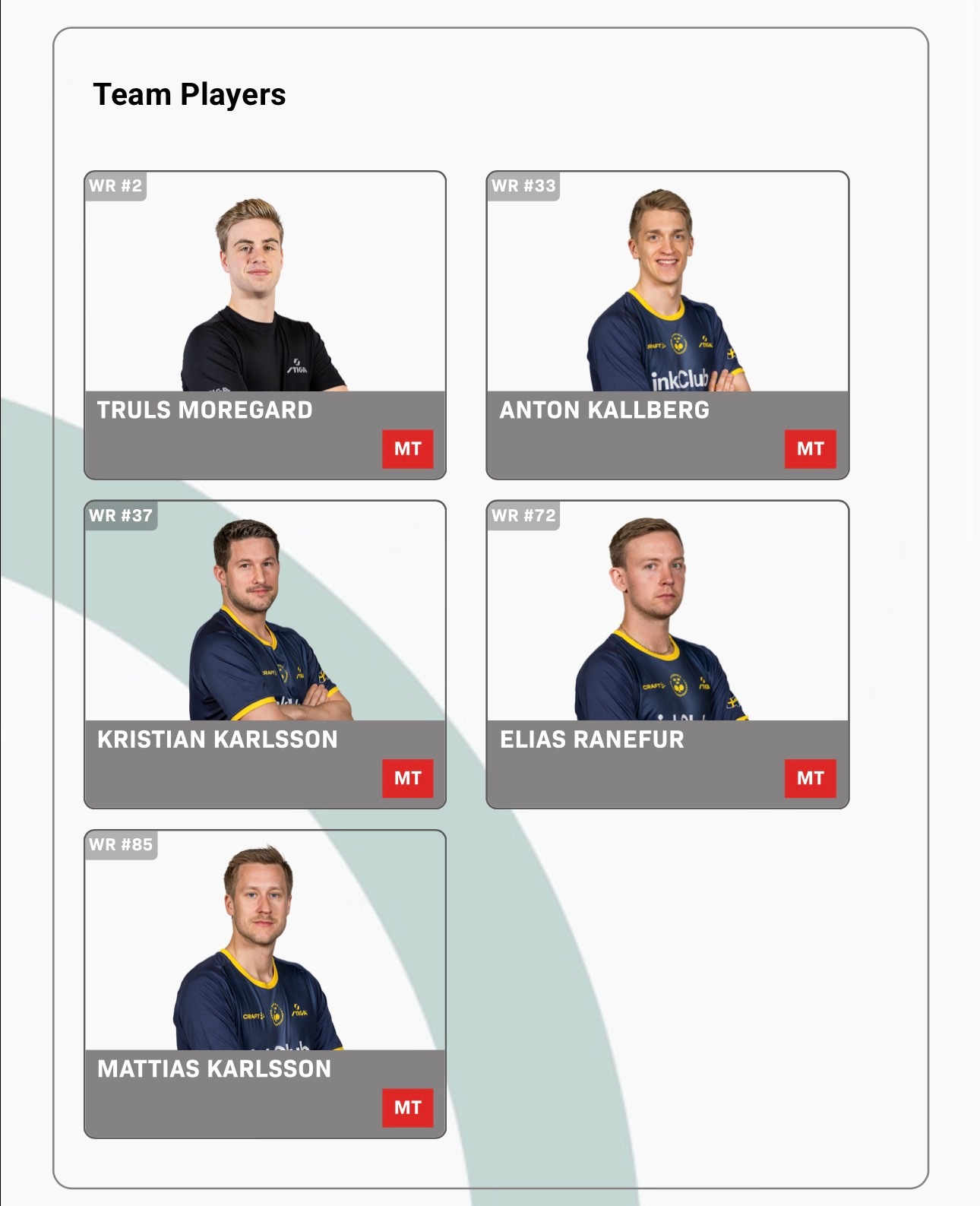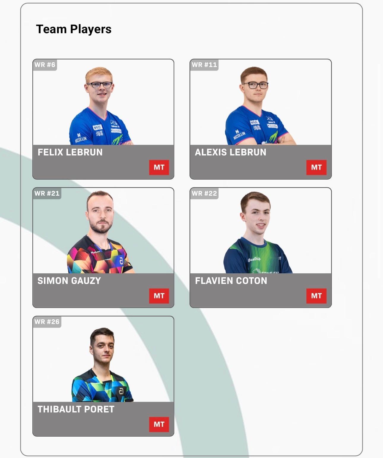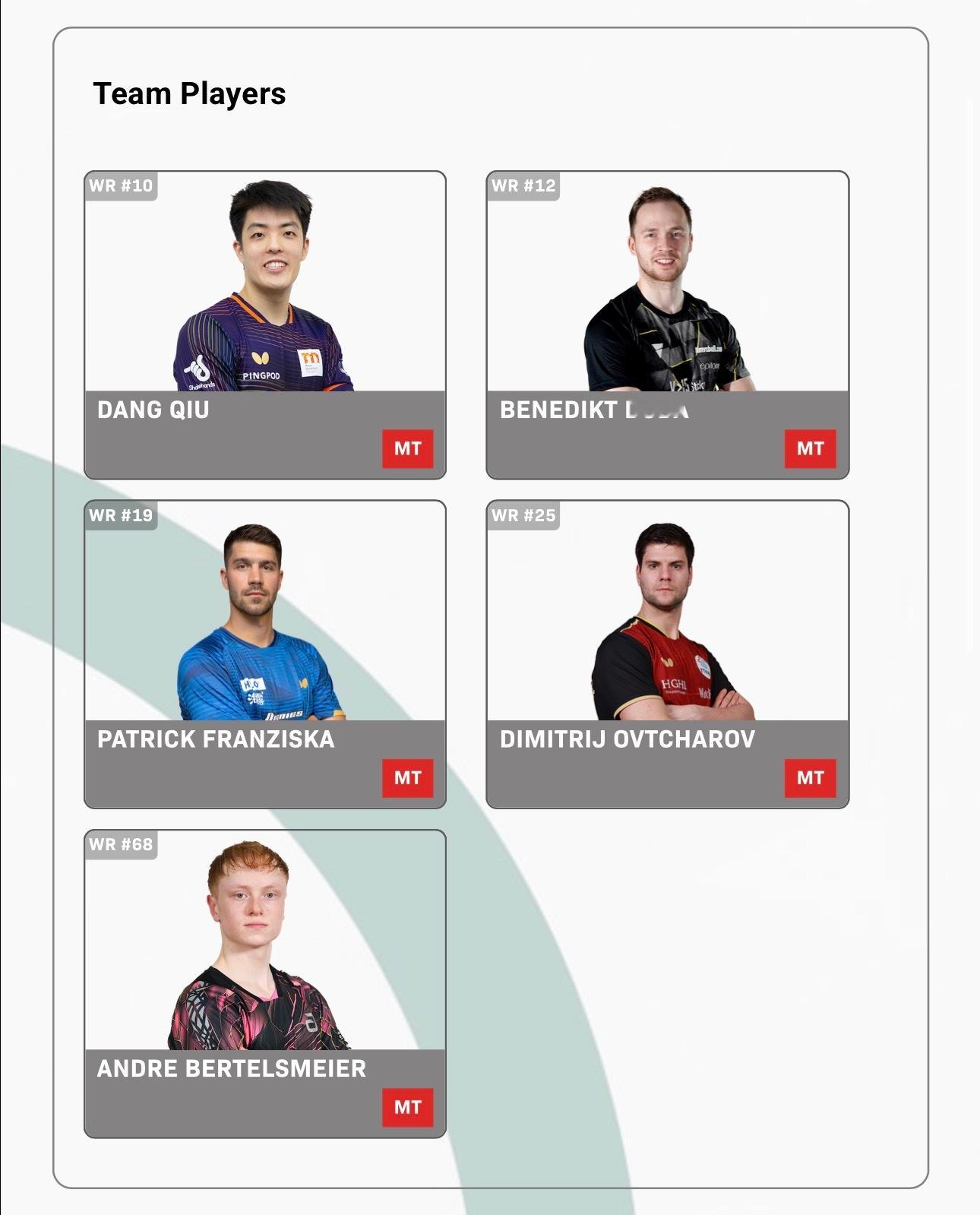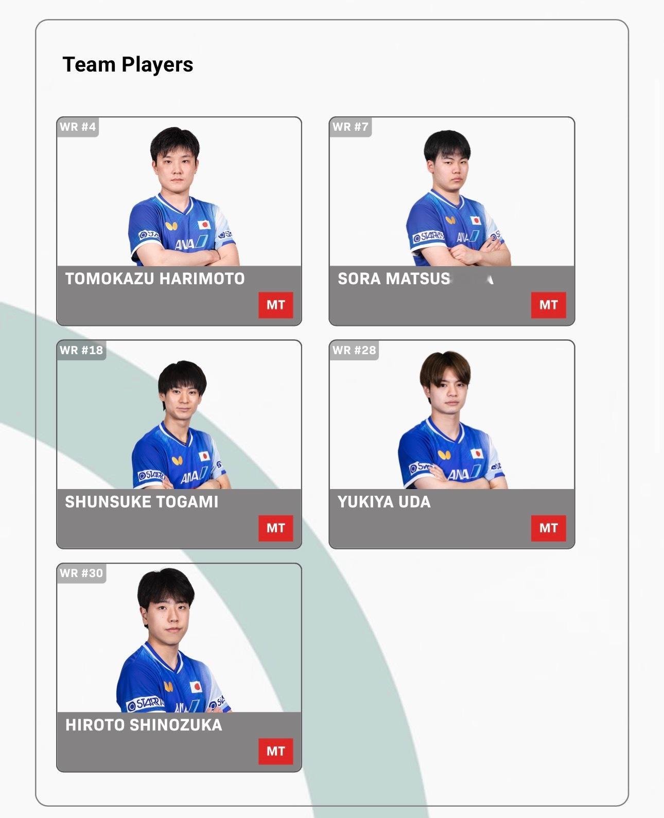 2026伦敦团体世乒赛【男团种子队参赛名单】乒乓球 【1组】中国队:王楚钦、林诗栋、梁靖崑、向鹏、周启豪瑞典队:莫雷加德、卡尔伯格、K卡尔森、兰弗利、M卡尔森 韩国队:张禹珍、安宰贤、吴晙诚、金庄原、林柳努英格兰队:贾维斯、格林、沃克、金克霍尔、亨特【2组】法国队:F勒布伦、A勒布伦、高兹、科顿、泊雷特日本队:张本智和、松岛辉空、户上隼辅、宇田幸矢、篠塚大登德国队:邱党、杜达、弗朗西斯卡、奥恰洛夫、贝特斯梅尔中国台北队:林昀儒、冯翊新、郭冠宏、洪敬恺、徐絃家