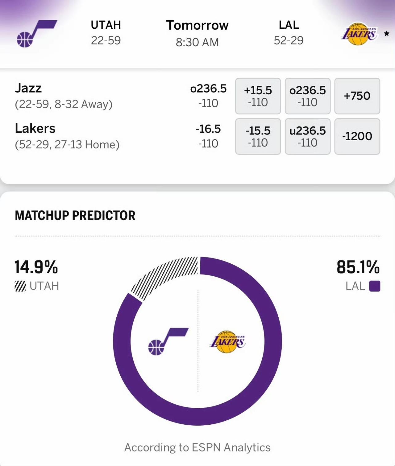 明天收官战也是爵士卡位战,爵士有多达8名主力轮休,湖人也轮休大部分主力,就这样,湖人胜率预计还有85%。