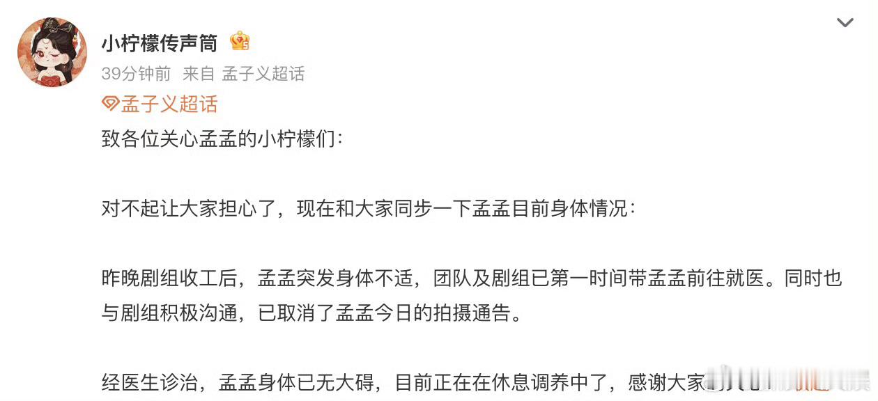 孟子义身体已无大碍 孟子义对接回应孟子身体状况,“昨晚剧组收工后,孟孟突发身体不适,团队及剧组已第一时间带孟孟前往就医。同时也与剧组积极沟通,已取消了孟孟今日的拍摄通告。经医生诊治,孟孟身体已无大碍,目前正在在休息调养中了,感谢大家的关心!”