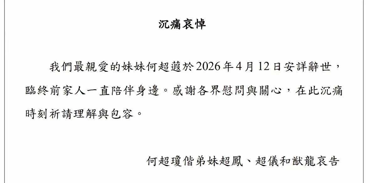 4月12日,香港商界与豪门圈传来悲痛消息——已故赌王何鸿燊与二房太太蓝琼缨的三女儿、信德集团执行董事何超蕸,于当日安详辞世,享年60岁。家属何超琼、何超凤、何超仪及何猷龙联名发布讣告,透露其临终前家人始终陪伴,同时感谢各界慰问,恳请公众理解这份沉痛时刻。