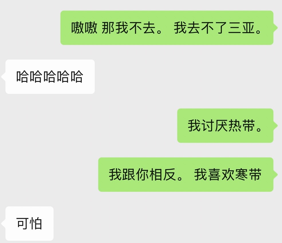 其实我特别不理解三亚买房这件事。 前几天有杂志拍摄封面人物我感兴趣。朋友喊我去。 我以为默认在北京呢。结果在三亚。 我可不去。 整个海南我就去过一次 永远都不会去了。三亚就是农村。 我的身体特别受不了热带。 我喜欢寒带。