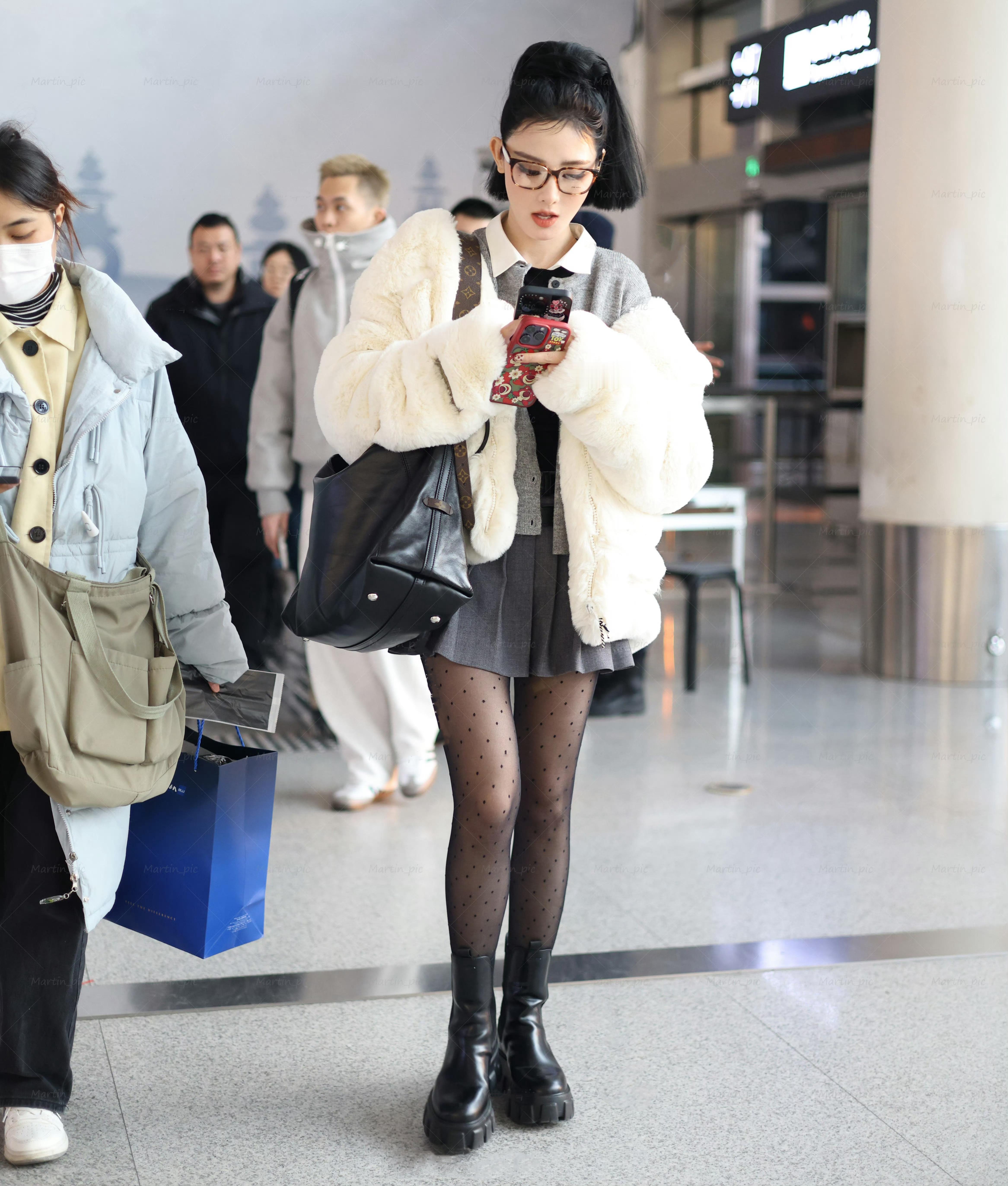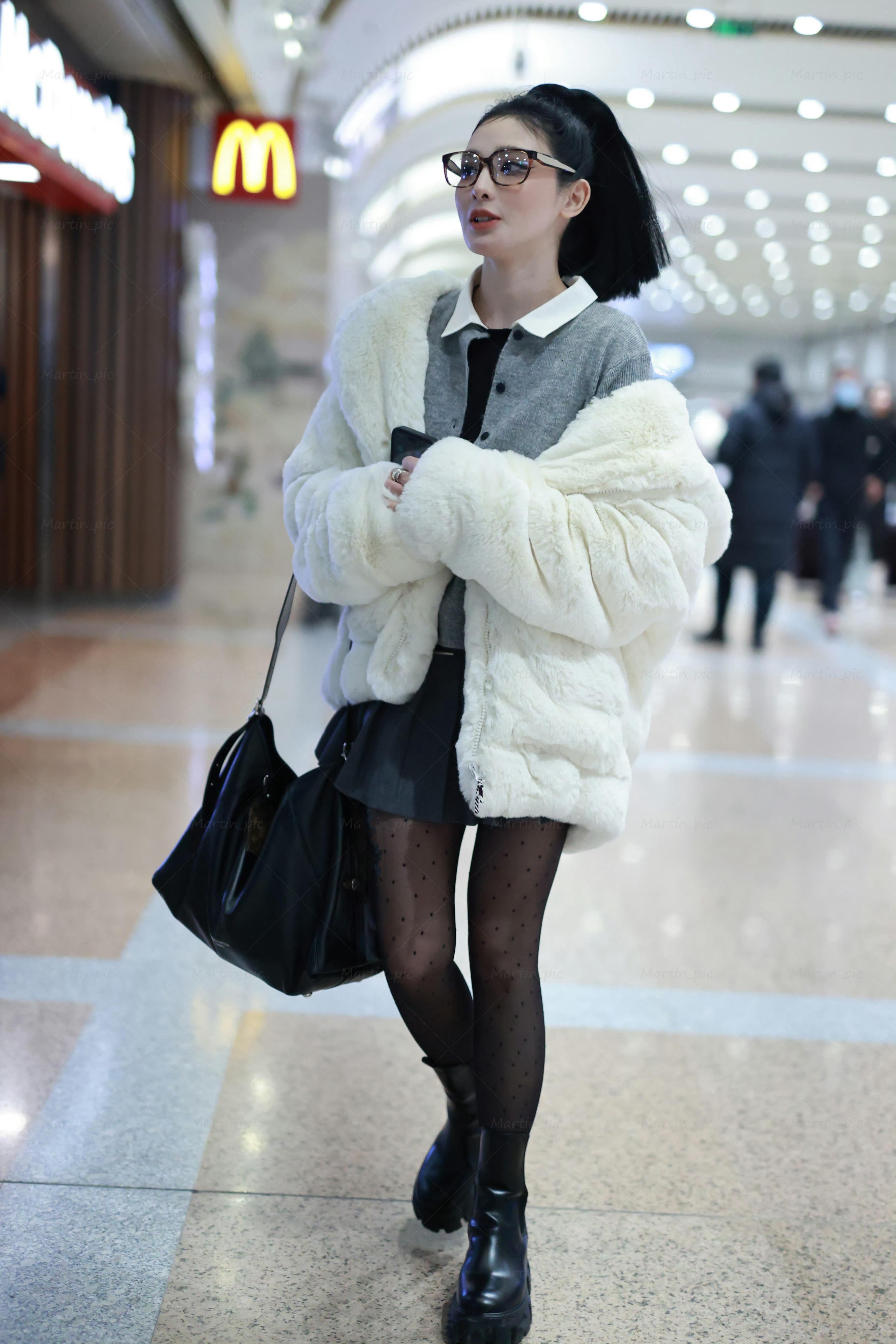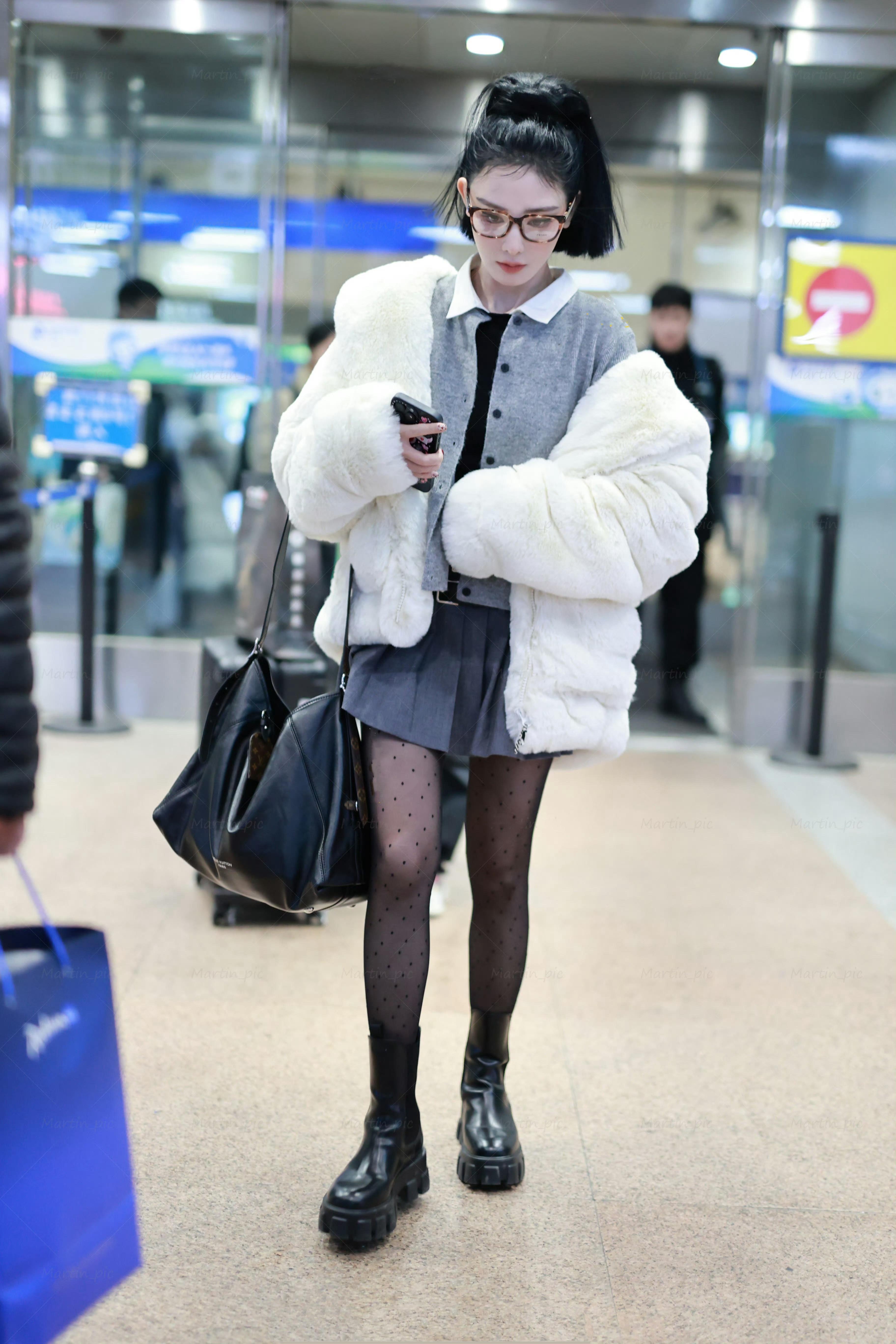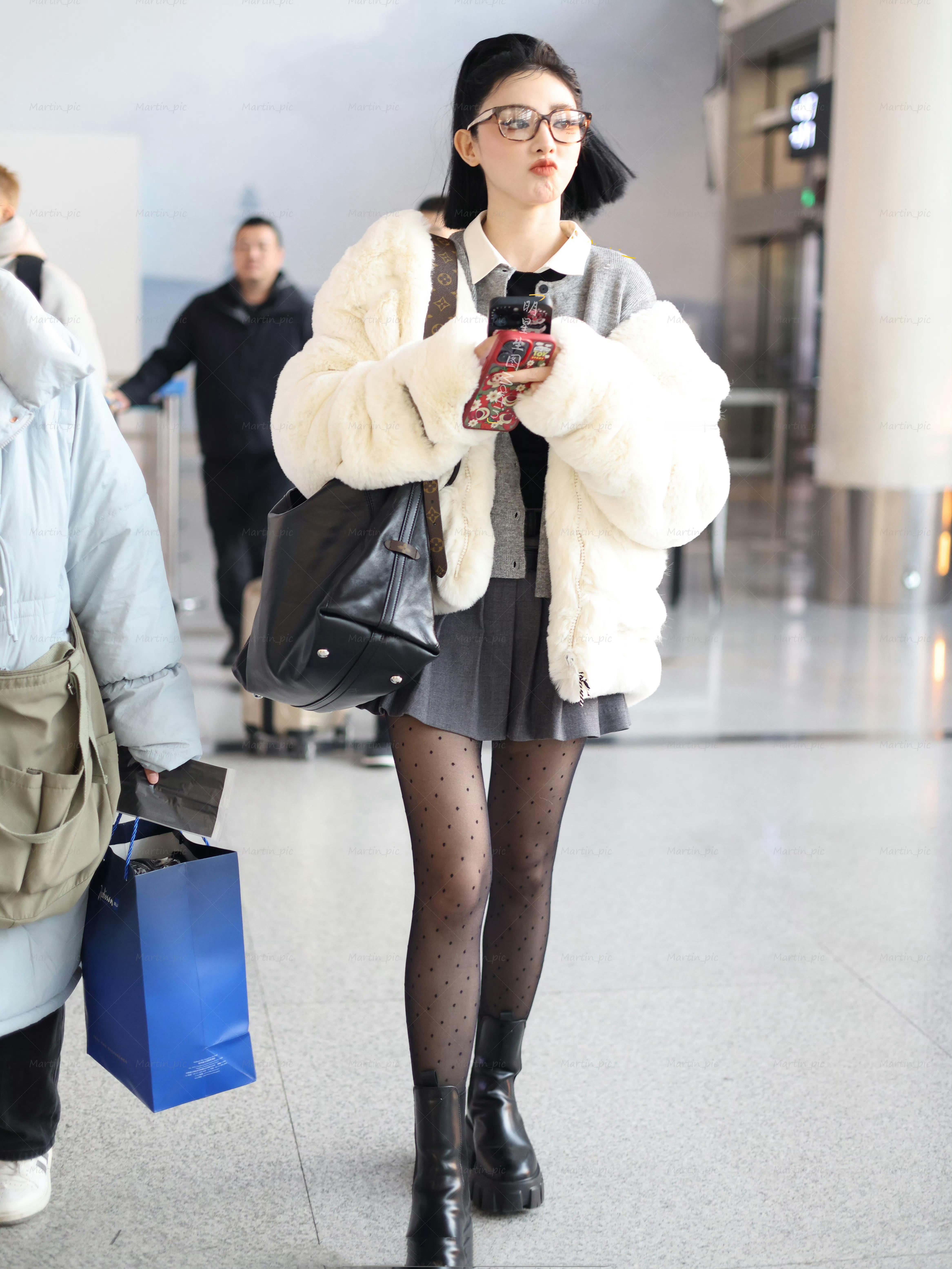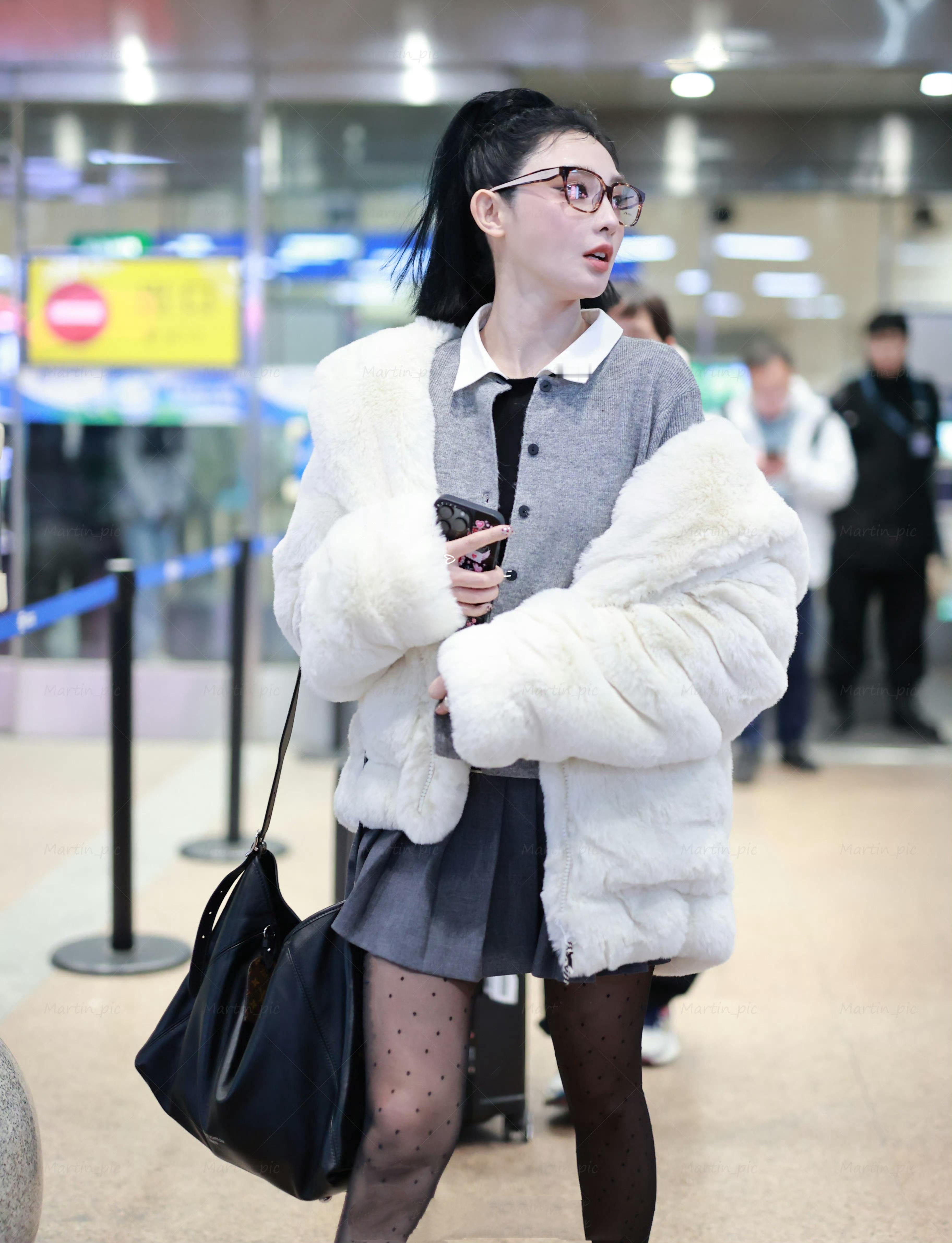 彭小苒好会穿搭,高马尾百褶裙配袜丝,机场私服穿出甜美时髦感。彭小苒