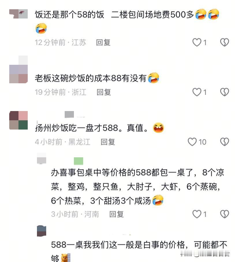 确实,普通人一盘蛋炒饭也就几块钱,超过二十都觉得多了,这个588的蛋炒饭还真是有点贵。不过有网友分析的也对,一盘炒饭可能不值这个价,可是吃蛋炒饭还是在包间,还有老板亲自服务,那也是算在内了吗?