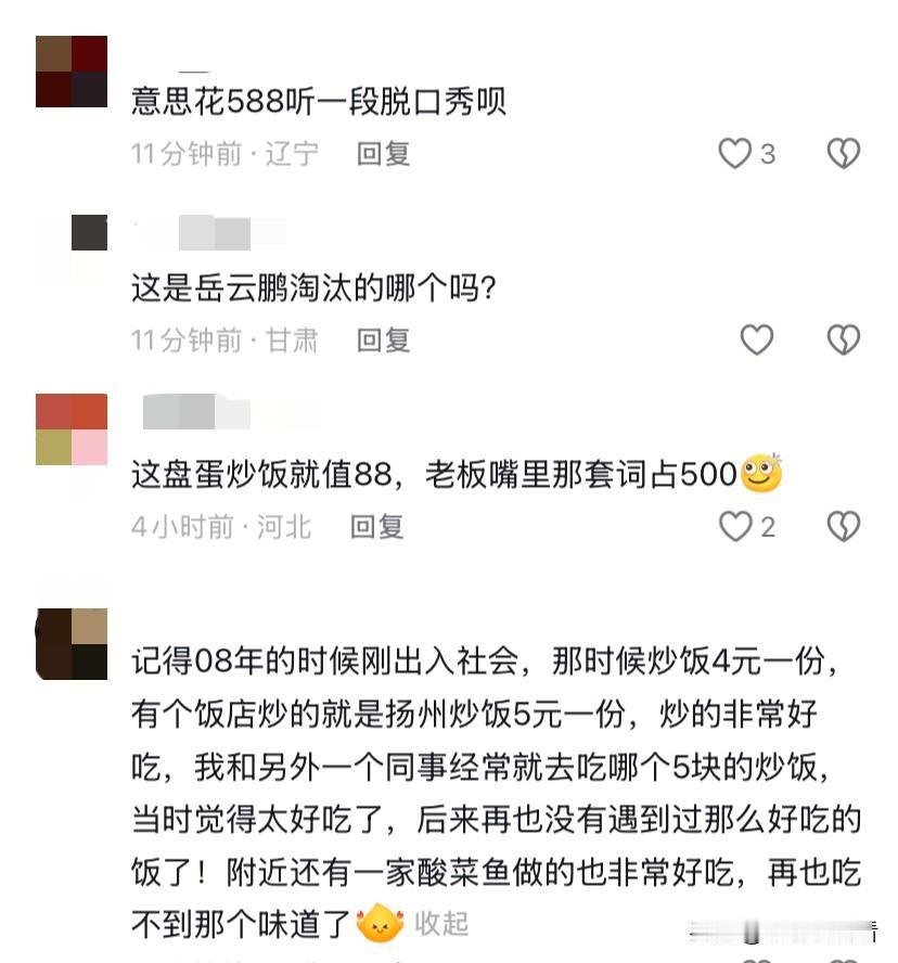 评论区有人说蛋炒饭值88,500块是老板说的那段话。还有人说,588相当于听了一段脱口秀。