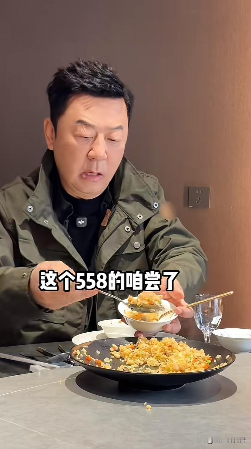 郭涛跟助理们一起品尝后,助理得出结论,跟蛋炒饭没什么区别。同时郭涛还点了一盘58的,端上桌,郭涛说感觉食材差不多,尝了一下口味也挺不错的。郭涛后悔没有直接点58的。