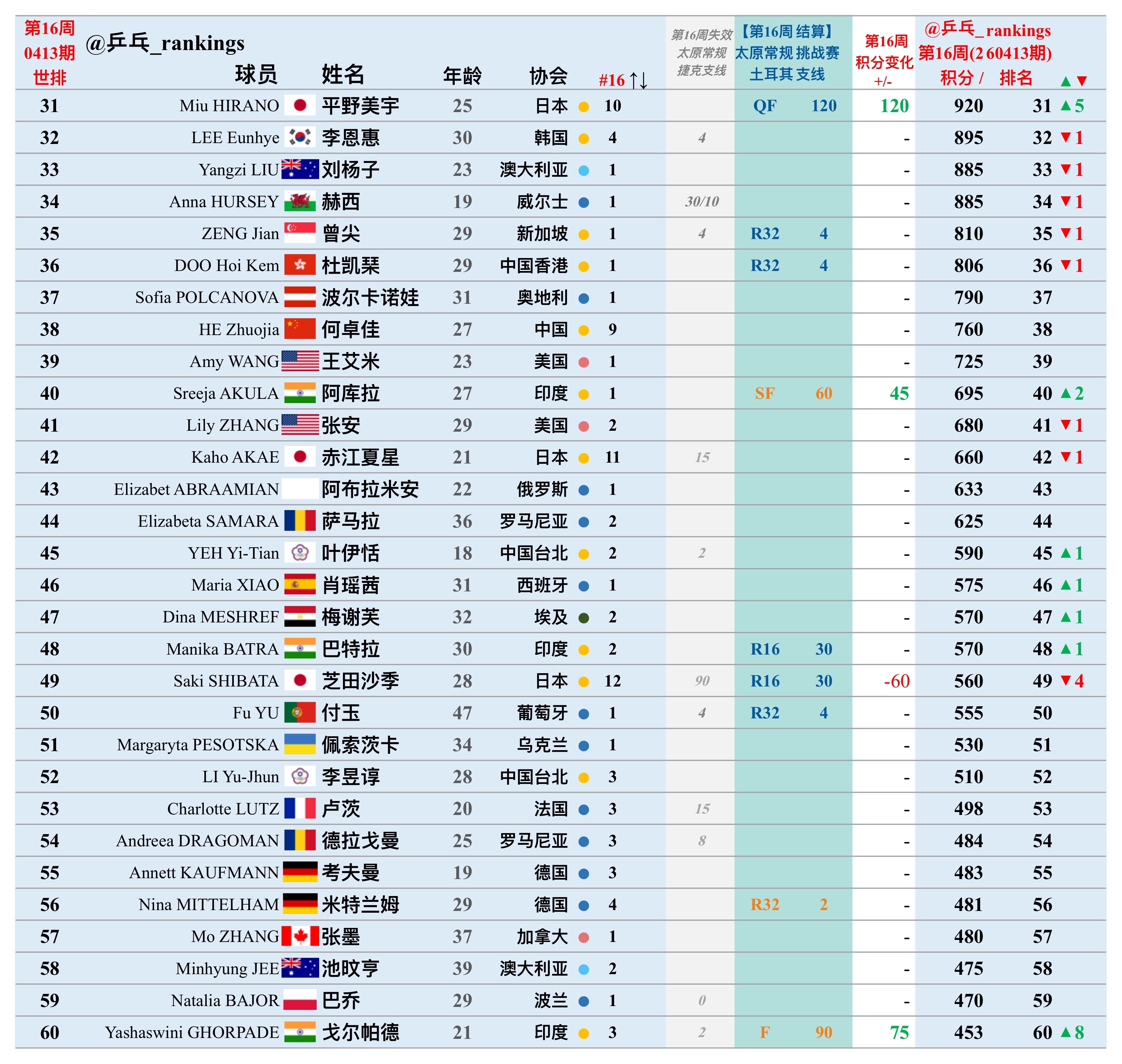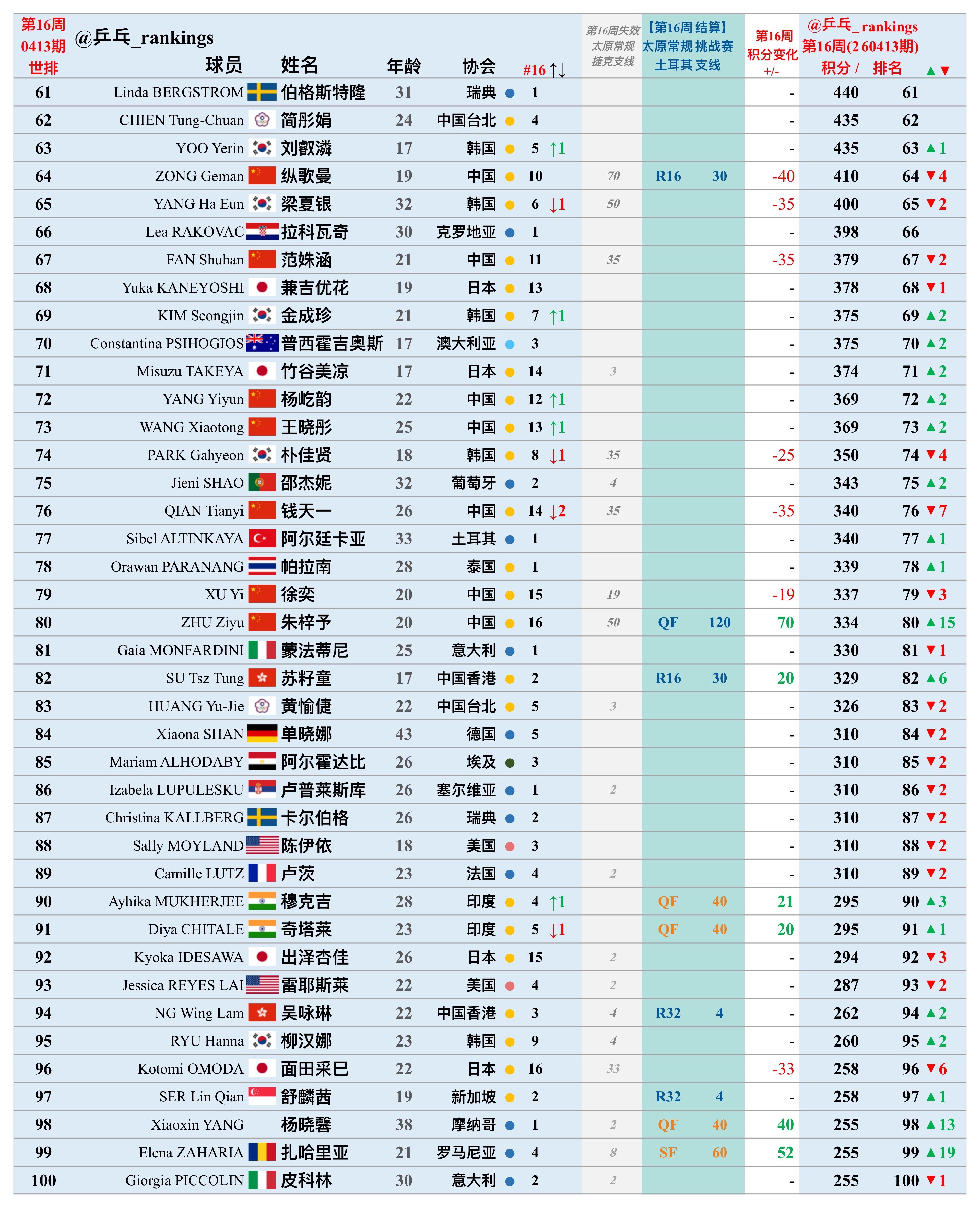 第16周世排积分变化(20260413期)【女单】🔺本周结算• WTT常规挑战赛太原站2026• WTT土耳其支线2026🔻本周失效• WTT常规挑战赛太原站2025• WTT捷克支线 2025