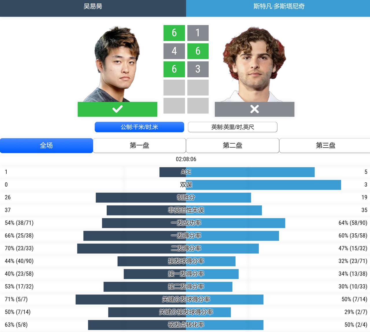 CH75萨拉索塔,男单决赛,吴易昺6-1,4-6,6-3击败多斯塔尼奇顺利夺冠。本周排名来到102位,距离重返百大仅差一步之遥。