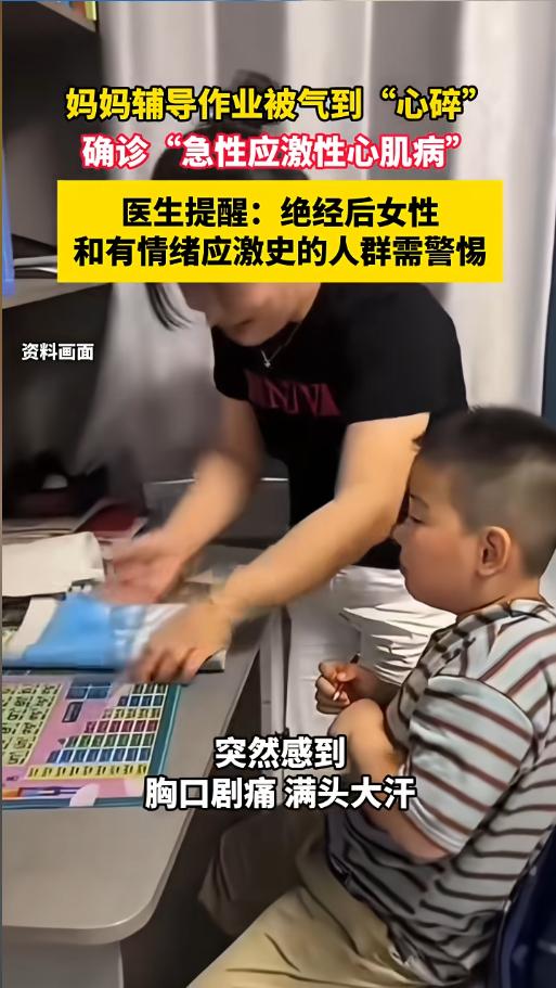 信息来源:《妈妈给孩子辅导作业被气到“心碎”,确诊“急性应激性心肌病”,医生提醒:绝经后女性和有情绪应激史的人群需警惕》杭州网