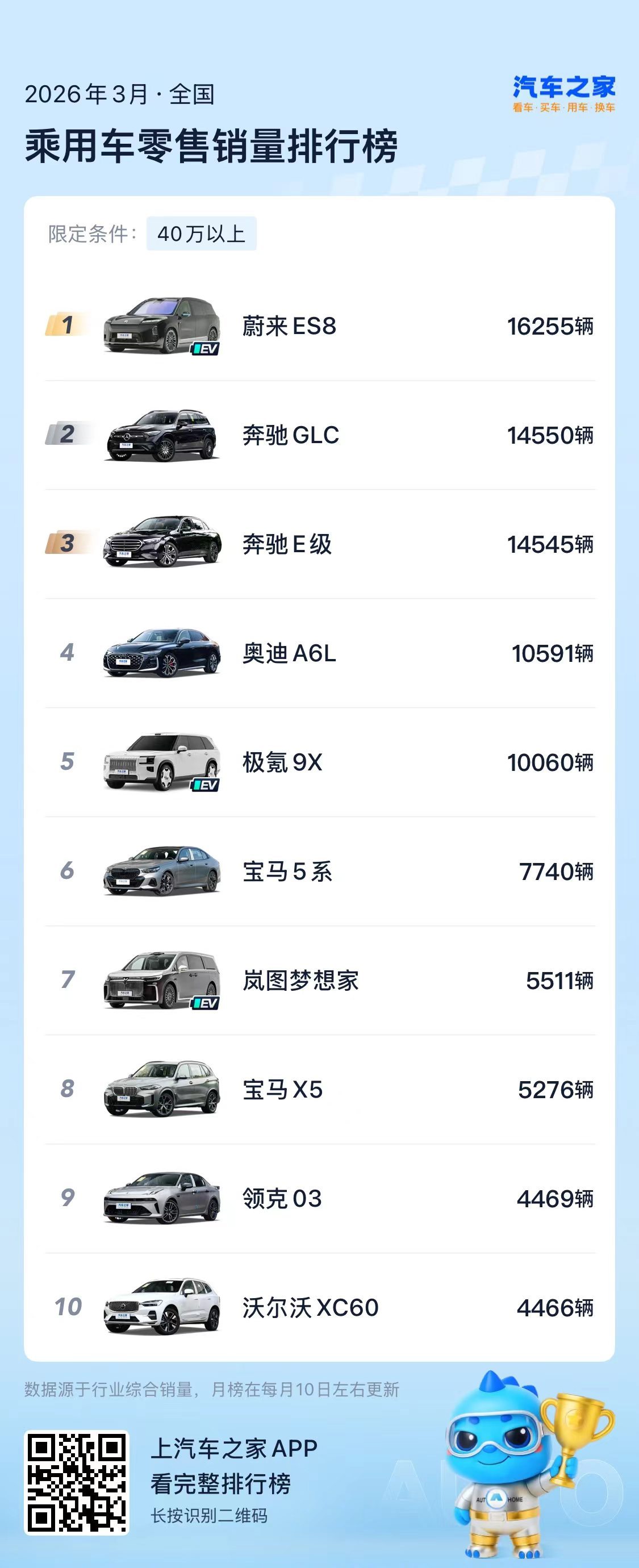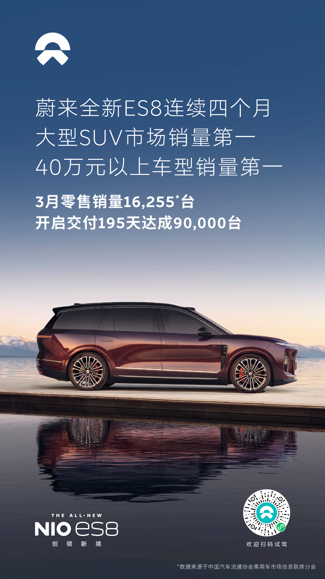 乘联会发布了最新市场数据,2026年3月,蔚来全新ES8零售销量16,255台,连续四个月斩获大型SUV和40万元以上车型销量冠军。从2025年10月到2026年3月的六个完整交付月里,全新ES8累计零售销量84,810辆,在大型SUV级别和40万元以上两个细分市场均排名第一。