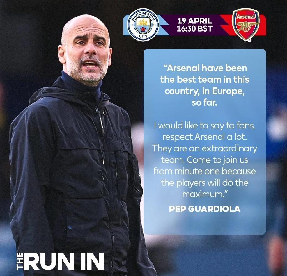 而瓜迪奥拉又开始在那里放烟雾弹了,他表示:阿森纳是目前为止这个国家、乃至全欧洲表现最好的球队。请充分尊重这支球队……