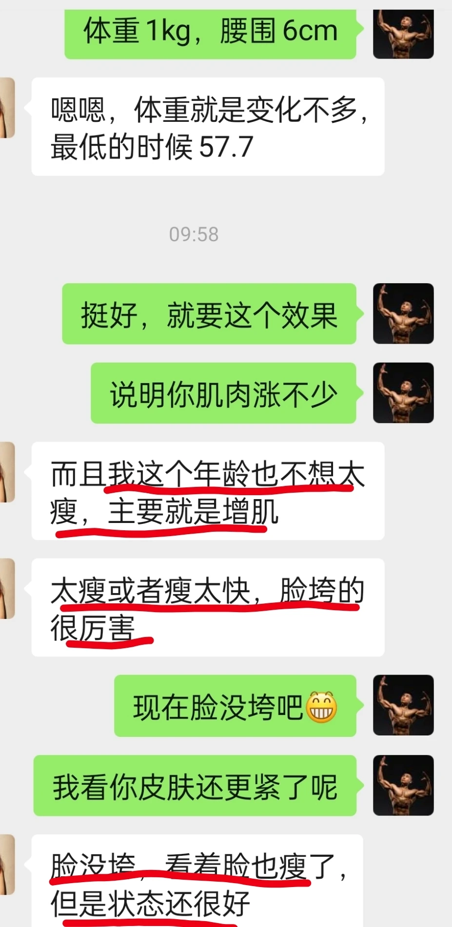 虽然体重只减了1kg,但腰围小了6cm,说明肥肉减少的同时,肌肉涨了不少。