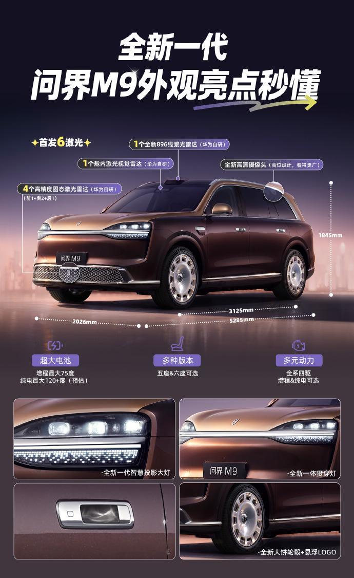 全新一代问界M9要来了。升级点小总结:全车6激光雷达、全主动悬架,贯穿大蓝灯、8