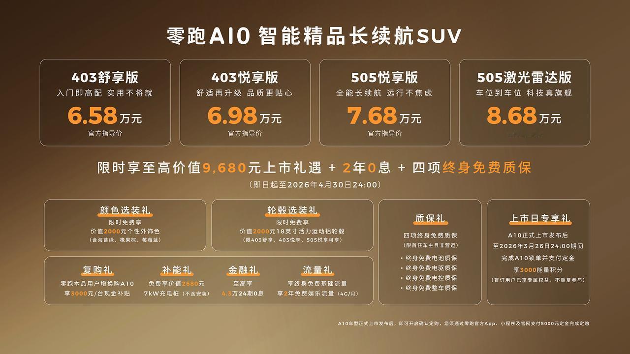 近日,零跑全新A平台首款车型零跑A10上市,有403km、505km两种续航共4个版本,售价6.58-8.68万元。