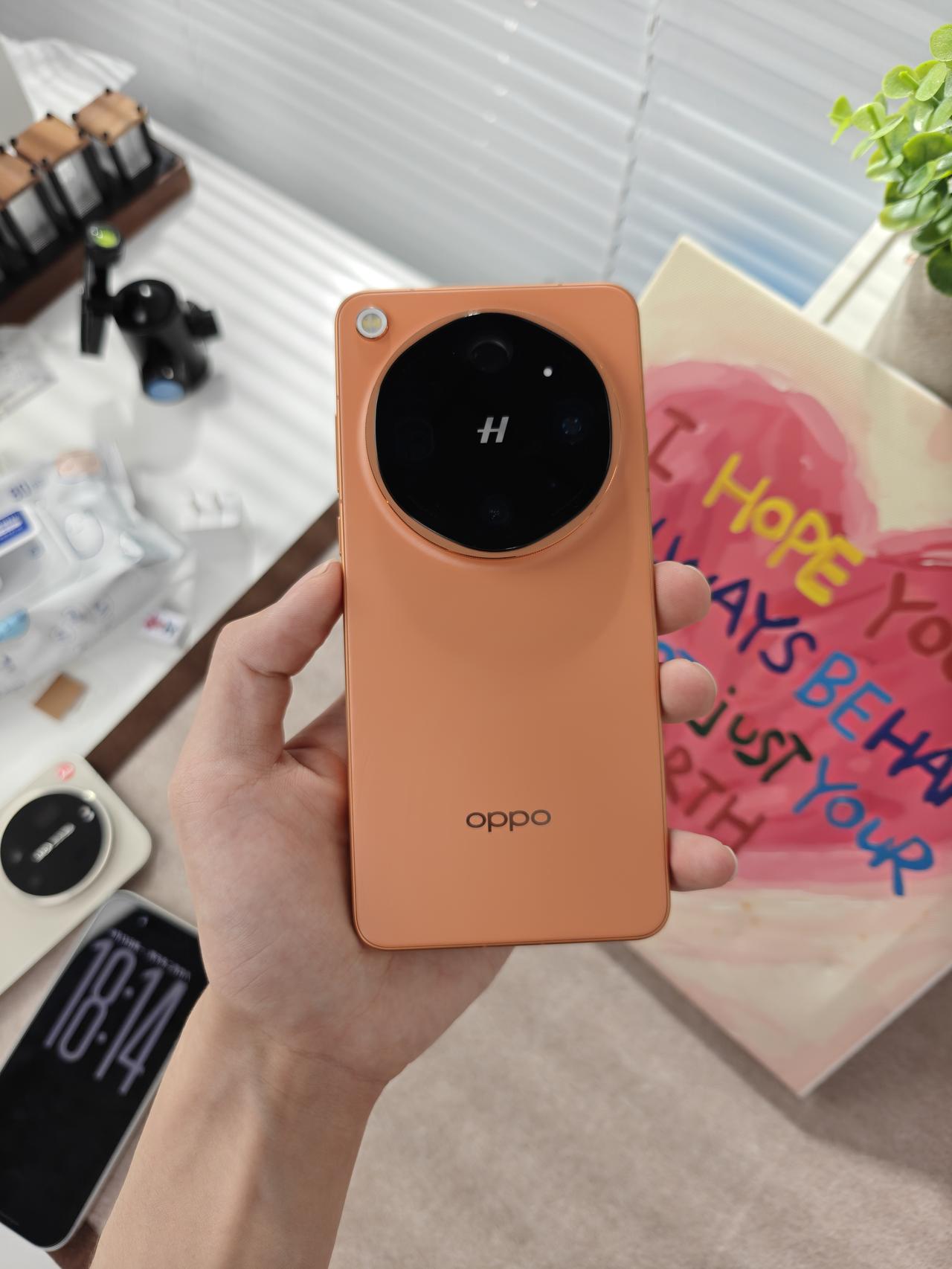OPPO这个橙色叫做绒纱峡谷,有点山中峡谷的感觉,纹理在光线下没那么明显,触感很细腻,质感还是OK的,至于八边形的镜头模组,辨识度是有的
