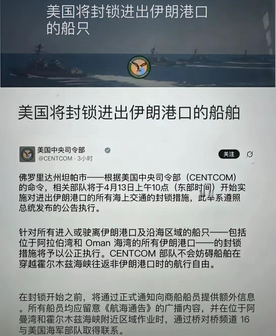 看美伊双方关于霍尔木兹海峡的发言! 美国将封锁进出伊朗港口的所有船舶!包括阿拉伯