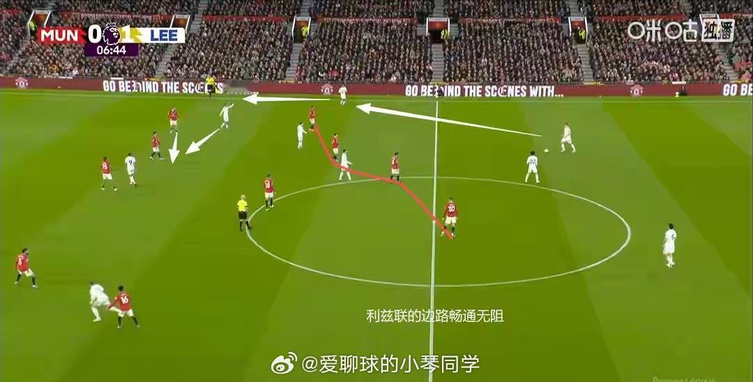 曼联1比2利兹联 ,战术失衡,2球落后+少打1人,卡里克调整来的太晚休息了25天,曼联还是松懈了,在争夺欧冠资格的关键比赛中遭遇一场溃败。曼联这场失利是来自于两个方面:一方面是战术失衡了,两个边路大举压上的策略,不仅仅没有压制对手,反而导致边路太空虚。而阵容配置又导致中场需要覆盖的范围太大,这就造成了上半场的失势。在2球落后、下半场少打1人的情况下,卡里克做出了非常合适的结构调整,用达洛特内收的方式,减少了中路覆盖的区域,从而释放了乌加特的性能,也保护了约罗的身侧空间,曼联的进攻也有了起色,只是换人调整来的太晚了。本场比赛,曼联开局便陷入战术失衡的困境,防线与中场衔接漏洞百出。比赛第5分钟,利兹联博格尔送出传中,奥卡福尔门前推射破门,帮助客队率先取得领先;第30分钟,奥卡福尔再度发力,在禁区弧顶轰出凌空世界波完成梅开二度,曼联短短半小时内两球落后,陷入极其被动的局面。