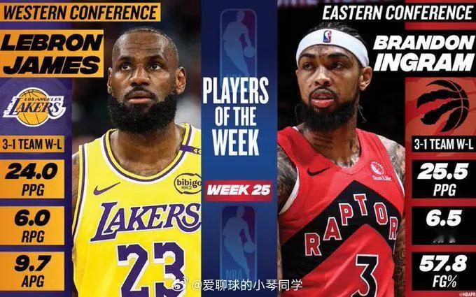 北京时间4月14日,NBA官方公布2025-26赛季最后一周的周最佳球员,湖人球星詹姆斯和猛龙球星英格拉姆分别当选西部和东部周最佳球员,詹姆斯赛季首次获得周最佳,生涯第70次获此奖项再创历史新高。西部周最佳——湖人队勒布朗-詹姆斯上周詹姆斯带领湖人拿到3胜1负的战绩,场均拿到24分6篮板9.7助攻——对阵勇士轰下26分8篮板11助攻2抢断1盖帽,对阵太阳拿到28分6篮板12助攻4抢断,收官战对阵爵士拿到18分4篮板6助攻3抢断(仅出战17分钟)。41岁詹姆斯本赛季第一次获得西部周最佳,职业生涯第70次获得周最佳再创历史新高,值得一提的是,詹姆斯上一次获得周最佳是在2025年2月4日,老詹时隔1年多再夺周最佳,以夺得西部周最佳结束生涯第23个赛季。 湖人官方第一时间晒海报祝贺詹姆斯,本赛季,詹姆斯出战60场比赛,场均登场33分钟能够拿到20.9分6.1篮板7.2助攻1.2抢断,带领湖人最终拿到53胜29负的战绩,他们将在季后赛首轮大战火箭。东部周最佳——猛龙队英格拉姆上周英格拉姆带领猛龙拿到3胜1负的战绩,场均拿到25.5分6.5篮板,投篮命中率57.8%——两战热火分别拿到23分6篮板3助攻和38分7篮板7助攻,对阵尼克斯拿到16分4篮板6助攻,对阵篮网拿到25分9篮板2助攻。英格拉姆也是赛季首次获得东部周最佳,生涯第5次获得周最佳,猛龙官方晒海报祝贺英格拉姆;本赛季,英格拉姆为猛龙出战77场比赛,场均拿到21.5分5.6篮板3.7助攻,猛龙将在季后赛首轮大战骑士。