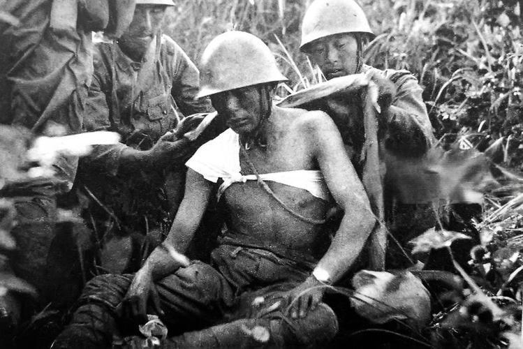 1938年9月,中国军队在富金山战役中给予侵略者的沉重打击,照片是侵华日军在富金山战役中狼狈负伤的真实模样,中间是负伤的鬼子,赤裸上身、肩部中弹,仅用简易绷带包扎,神情萎靡;两侧日军为其做战地简易包扎。