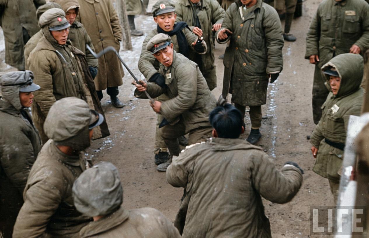 这两张定格在1948年淮海战役战场上的照片,由美国《LIFE》杂志随军摄影师拍摄于1948年11月-1949年1月淮海战役(徐蚌会战)期间,它撕开了国民党军最不堪的遮羞布,在与解放军决战的前线,国民党士兵没有在战场上奋勇杀敌,反而当众斗殴,围观者起哄,长官不作为。