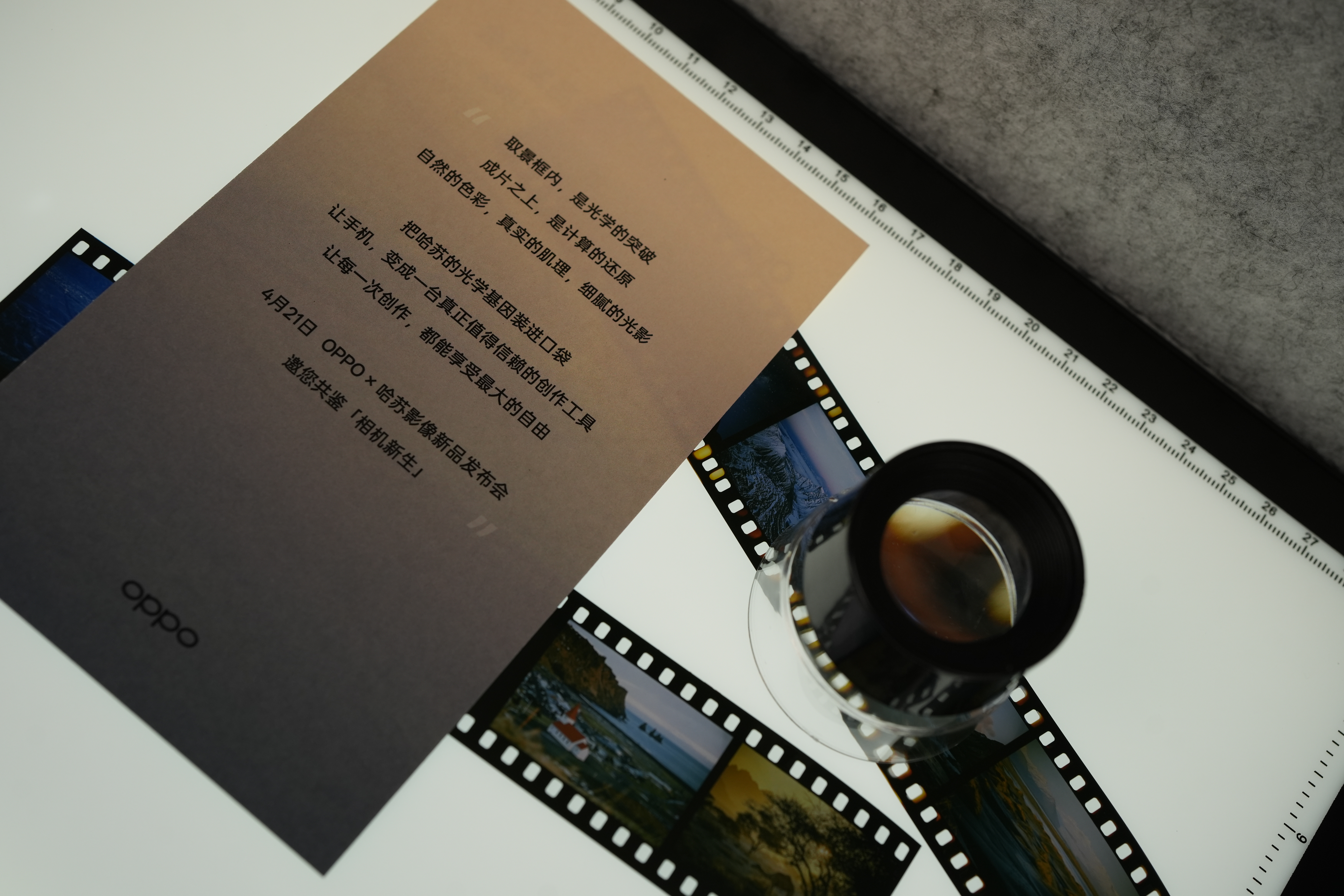 OPPO × 哈苏影像新品发布会的邀请函收到了,邀请函里是两段X9 Ultra拍摄的照片做的实体胶片,还附赠了观片套装。