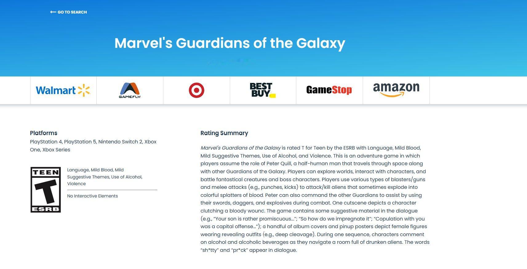 ESRB 列出了《漫威银河护卫队》的 Switch 2 版本评级。《漫威银河护卫队》被ESRB评为 T(青少年) 级,原因为:语言、轻度暗示性主题、酒精使用、暴力。