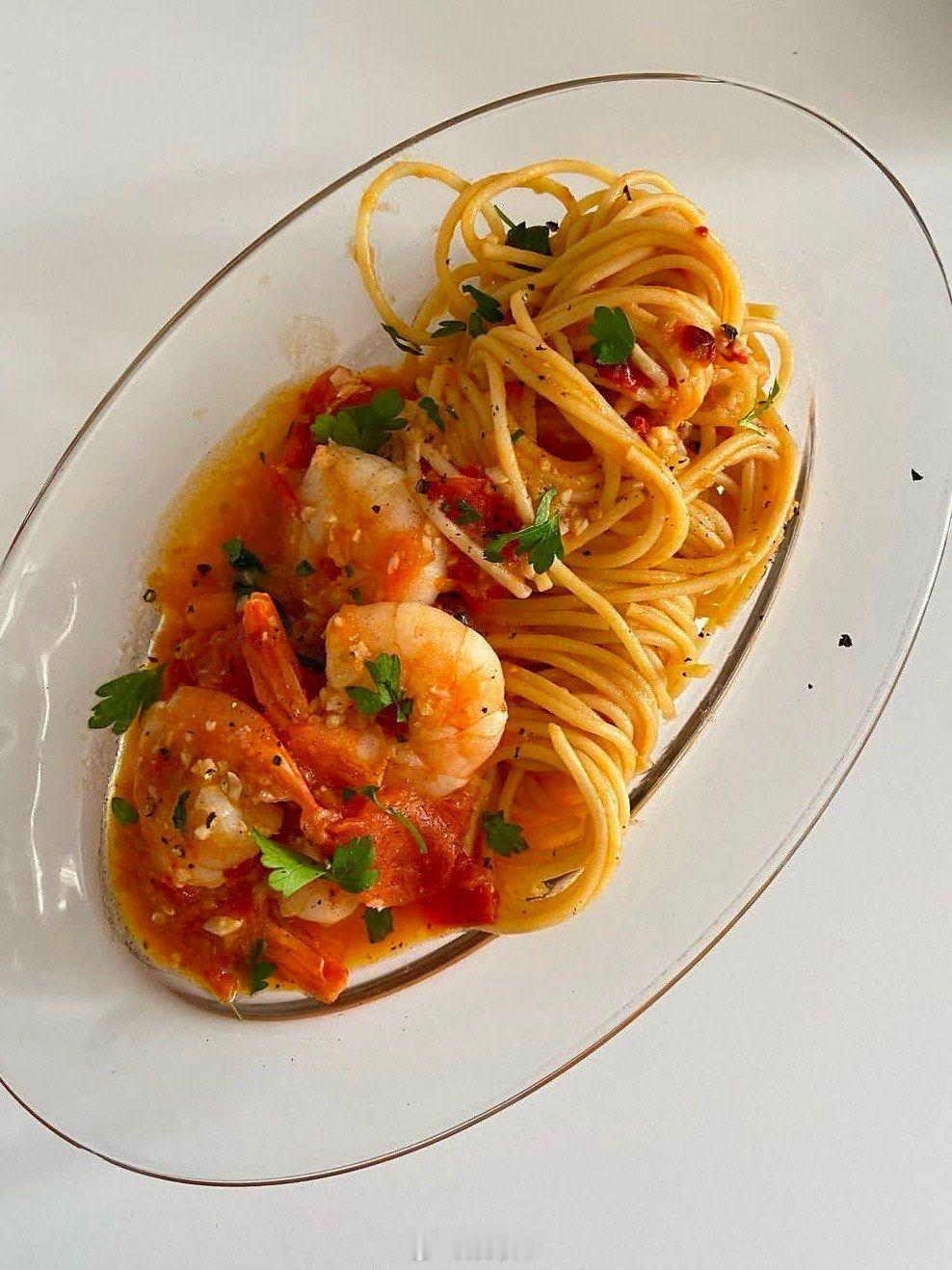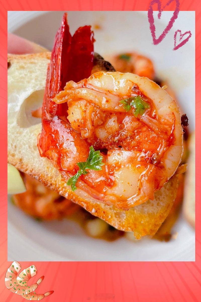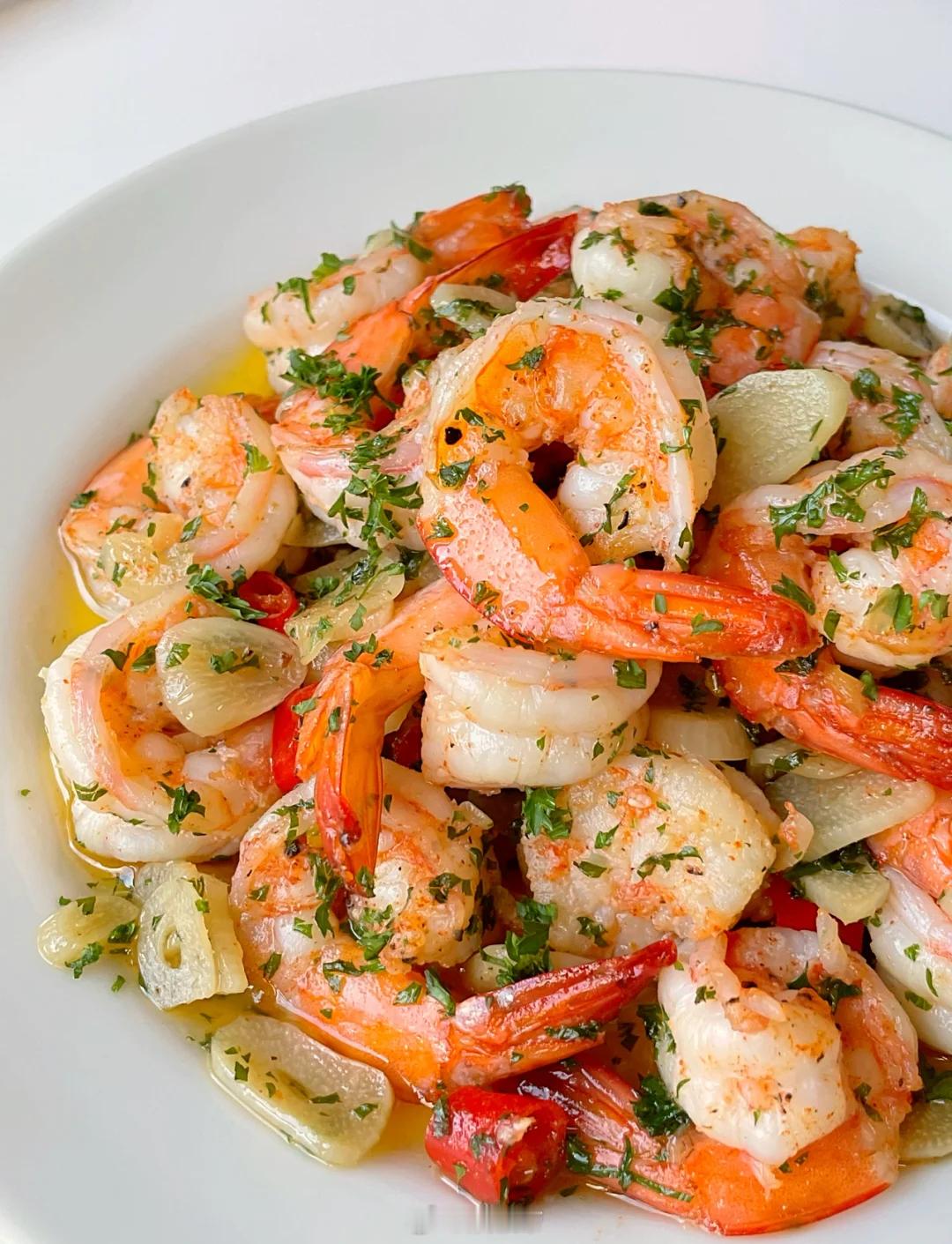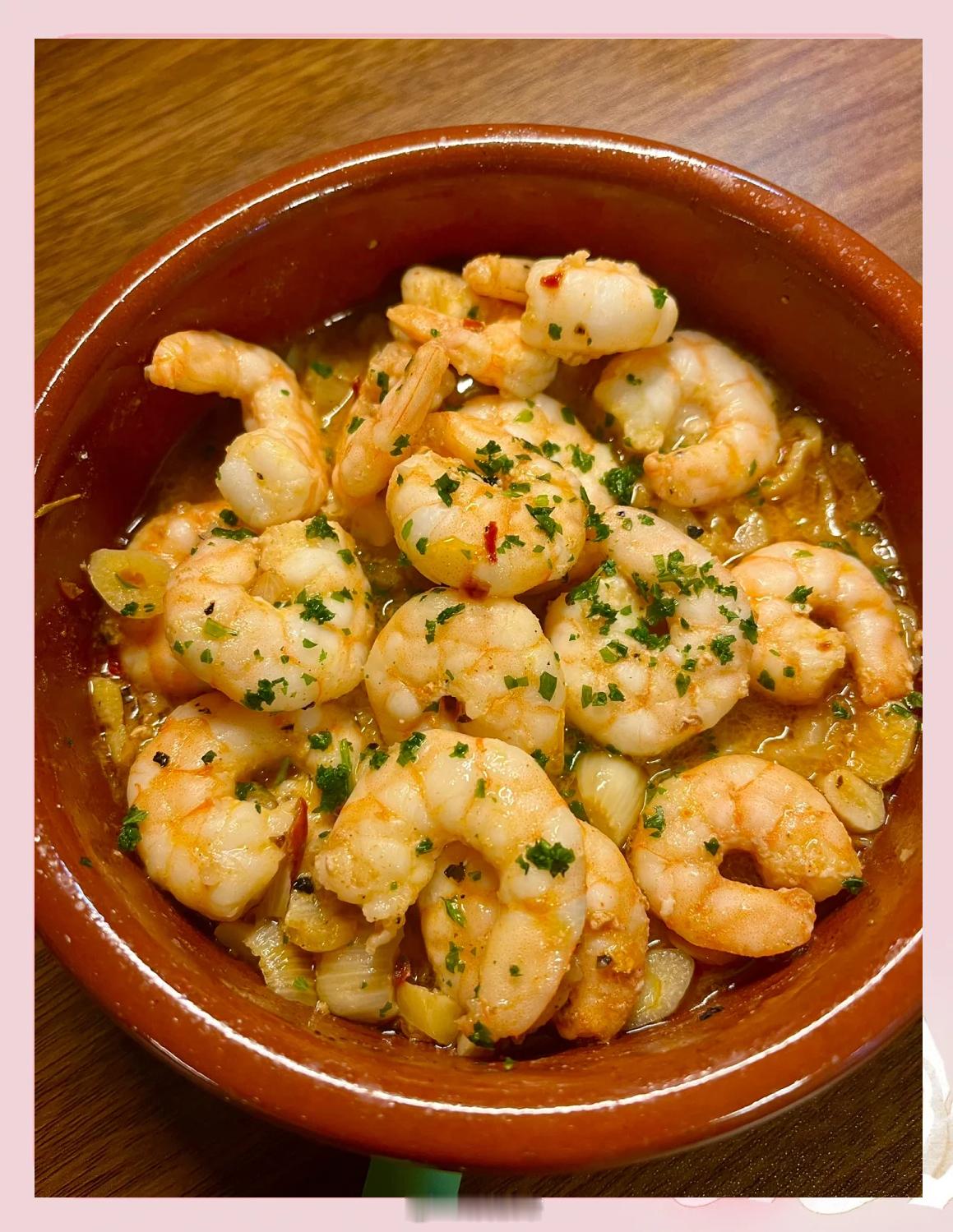 食趣西班牙 【西班牙蒜香大虾】食材:大虾、大蒜、干辣椒、橄榄油、欧芹、白葡萄酒、盐。做法:大虾开背去虾线,大蒜切片;橄榄油烧热,爆香蒜片与干辣椒,放大虾煎至变色,加白葡萄酒焖煮2分钟,撒欧芹碎,蒜香浓郁,虾肉鲜嫩。EatLikeaSpaniard西班牙美食美酒