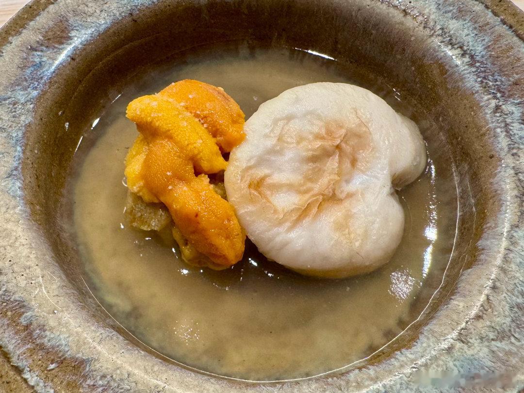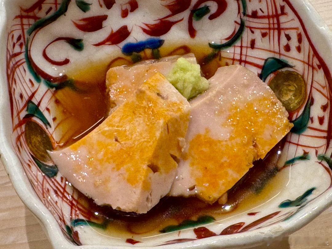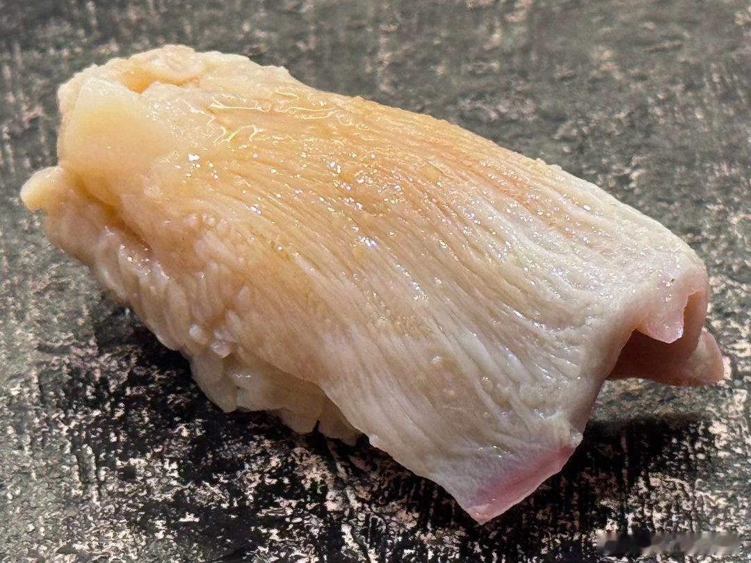 然后是目录上一长串寿司:白乌贼、真子鲷鲈鱼、图3鲜美的北极贝、春季小鲷鱼、图5白鱼(银鱼)、图6超好吃的沙丁鱼、鲣鱼。之后是鲍鱼和鲍鱼汁,然后是图7鲍汁拌饭配海胆和河豚白子,鲜美极了。一道很酸的白虾之后,是金枪鱼赤身和托罗,最后是小肌、烤星鳗、蛋糕和金吉鱼味增汤,图8是鲜甜的鸟贝,图9是大将在上大托罗。