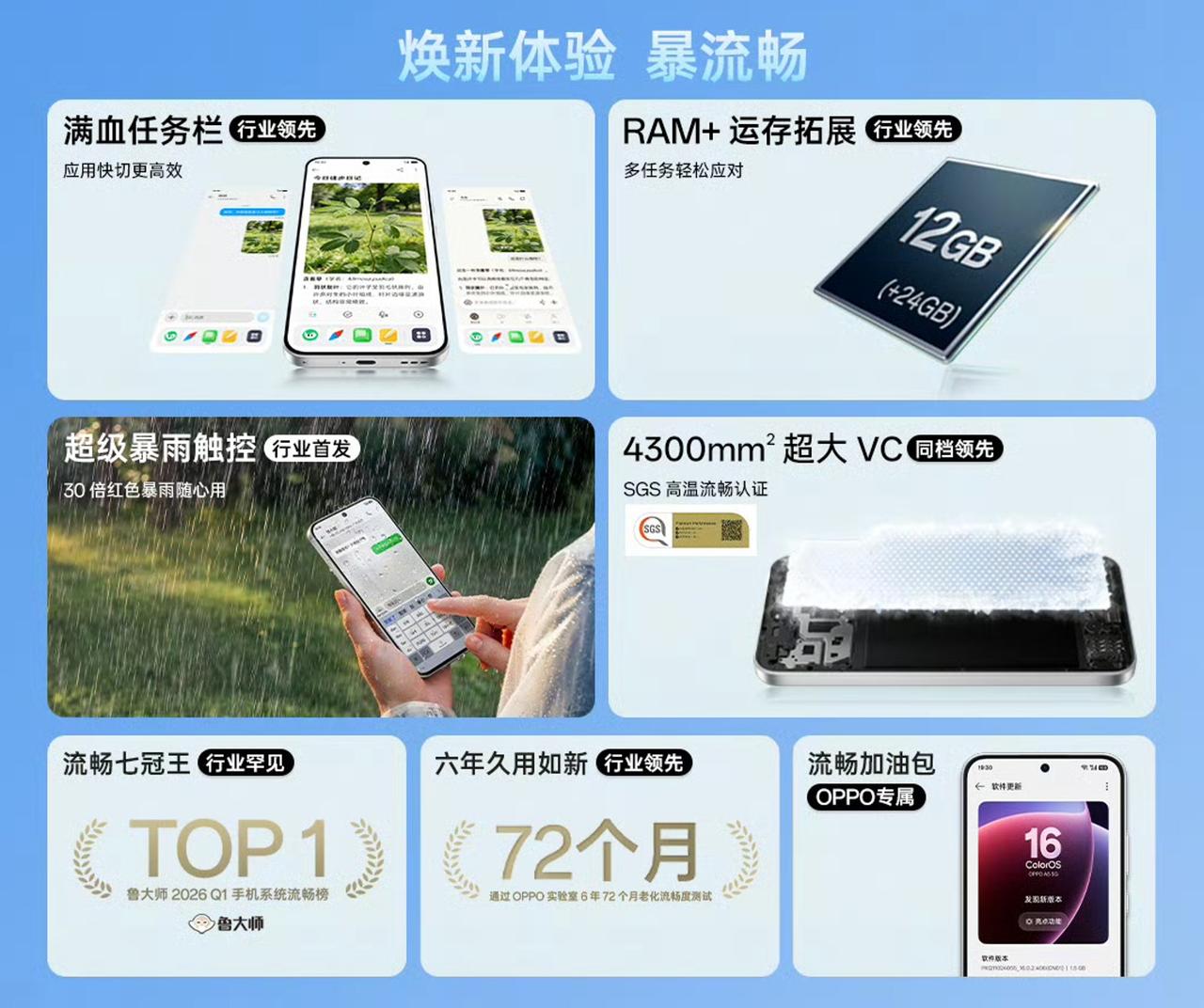 超级暴雨触控、满级防水、山海弱网通信、辅助定位、超级音量、NFC、屏下指纹,还有ColorOS。