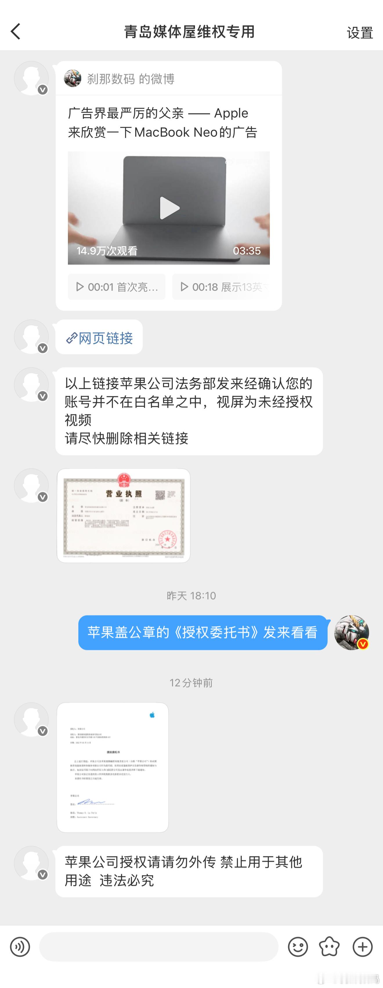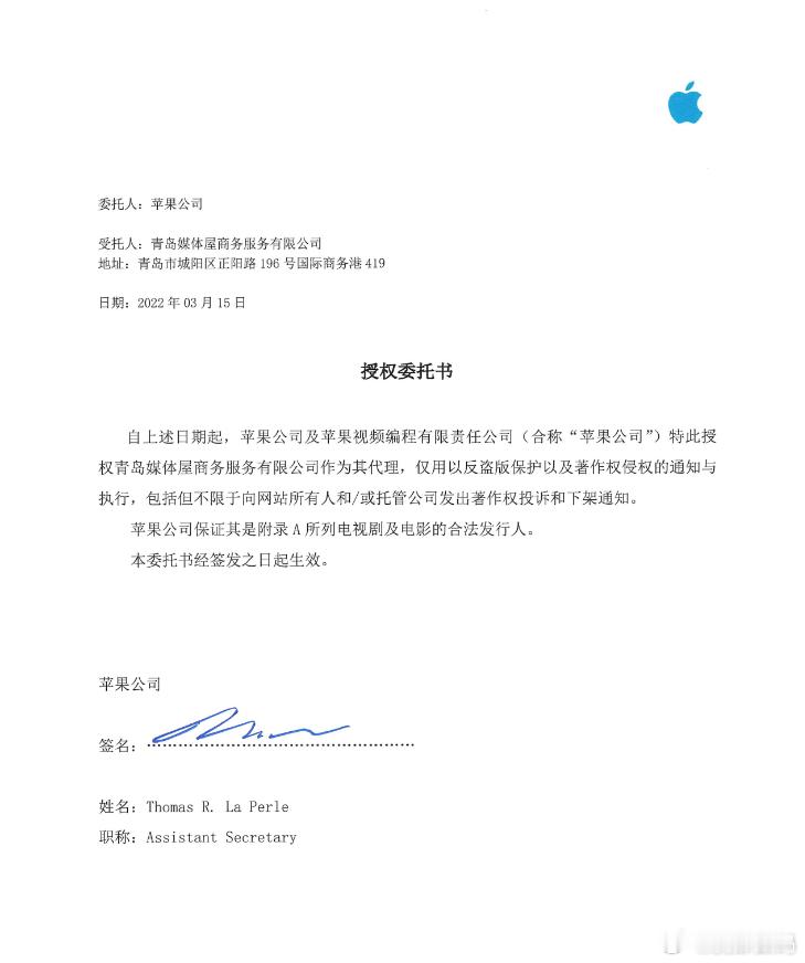 后续来了,发了个苹果签名的委托授权书给我看。我还是不信,苹果会不允许网上传播产品宣传视频? 而且,我发的是MacBook的视频,你这授权书咋写的电视剧和电影?针对Apple TV+那些影视剧资源的授权书吧。