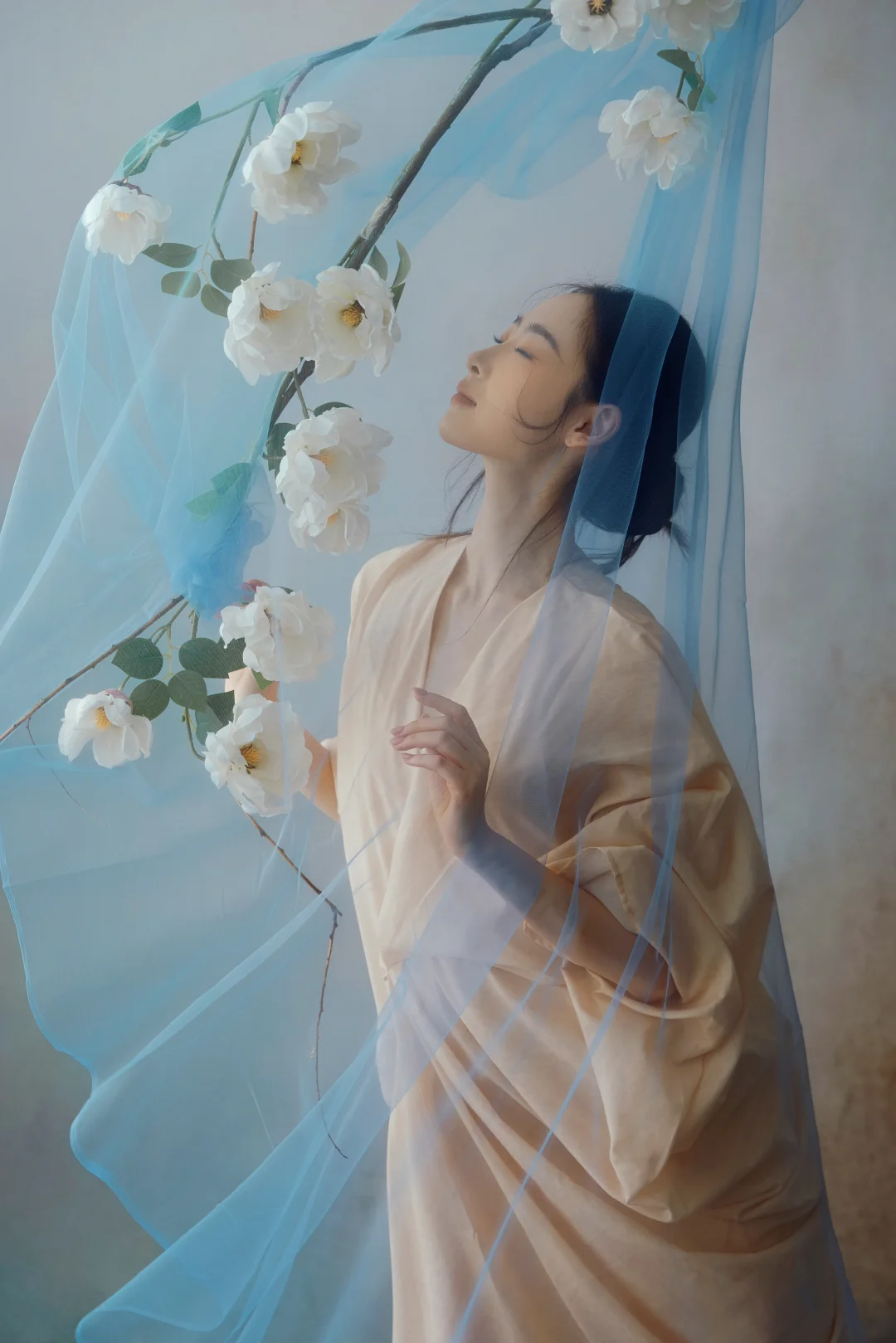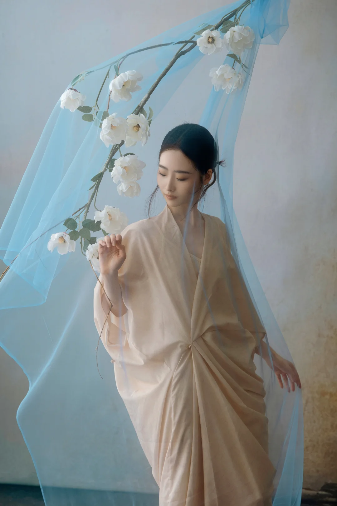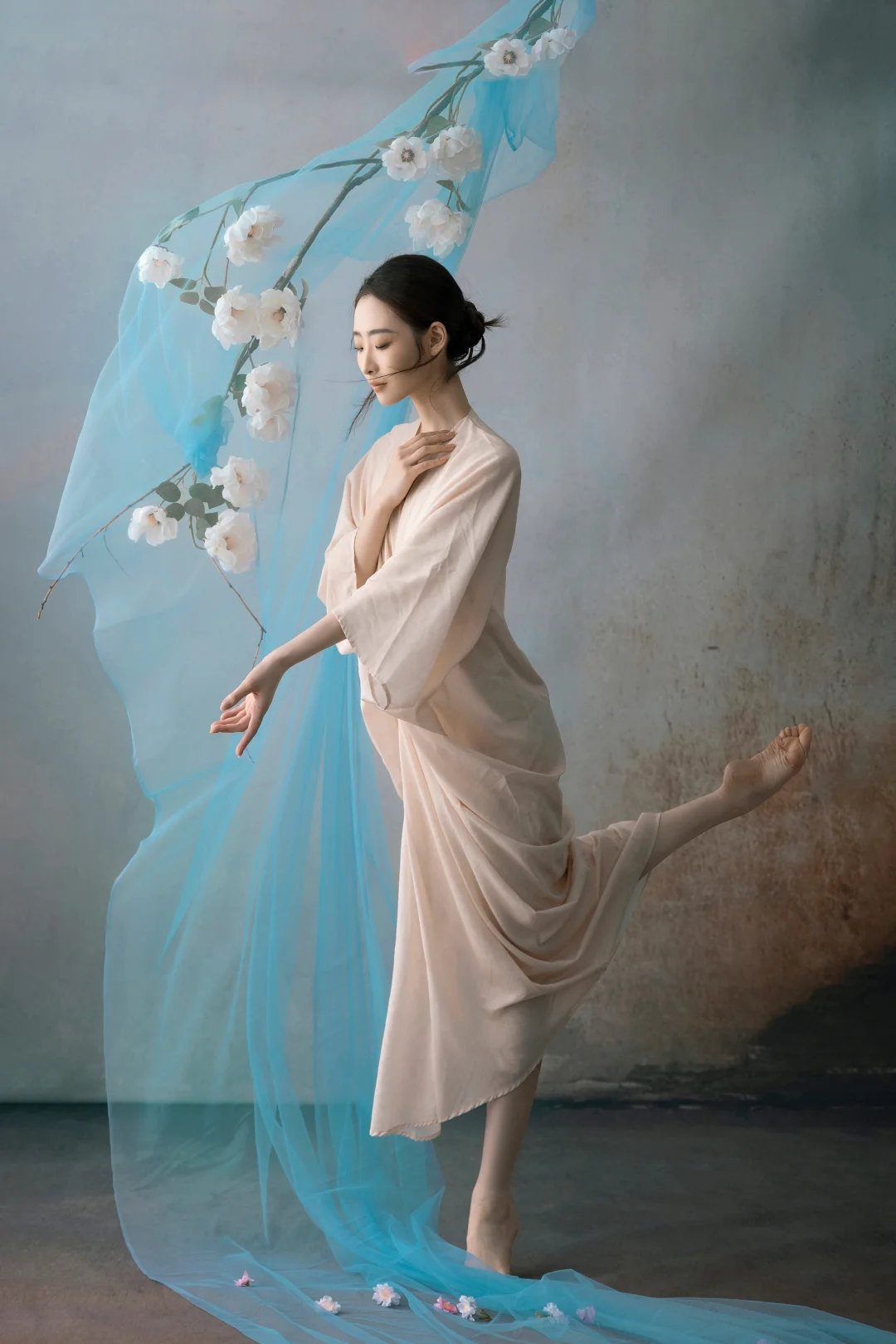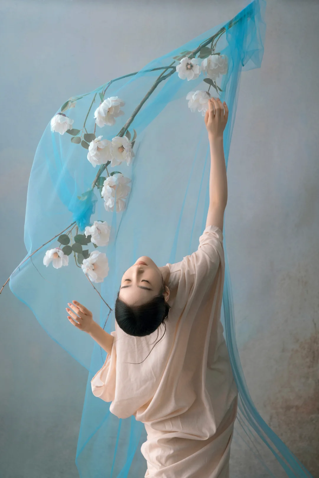 淡杏色的棉麻裙衬出舞者的温柔,冰蓝色的纱幔像把春日的风都揉进了镜头里,搭配山茶花的点缀,氛围感直接拉满!
