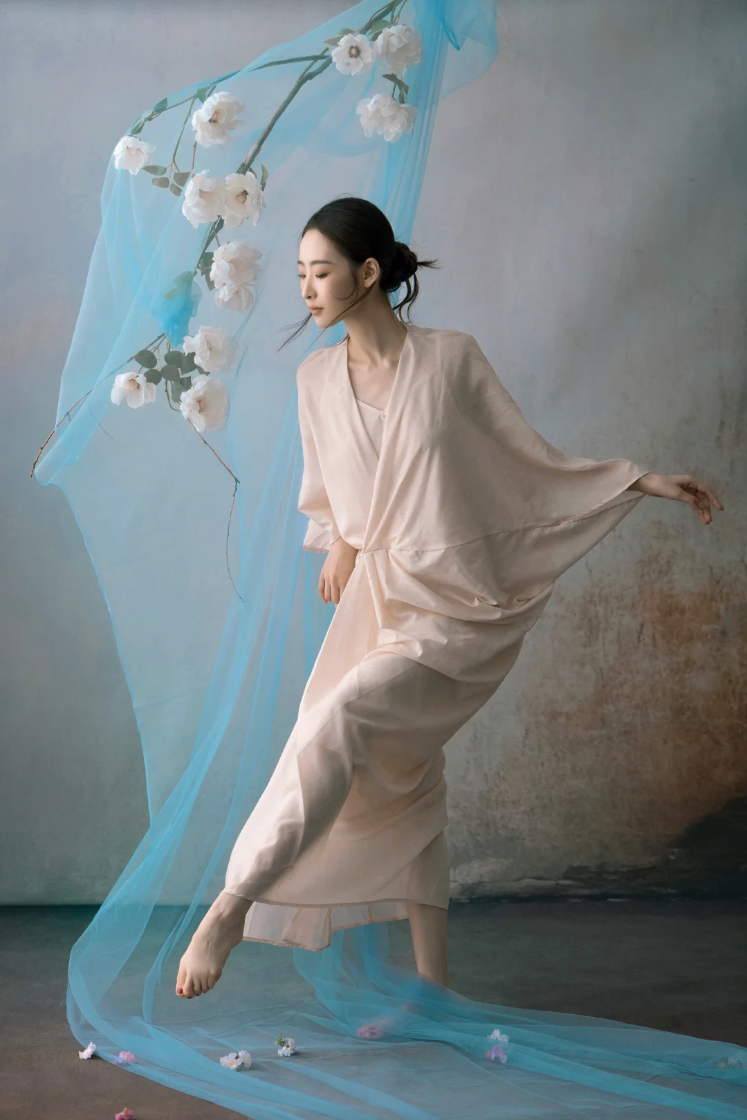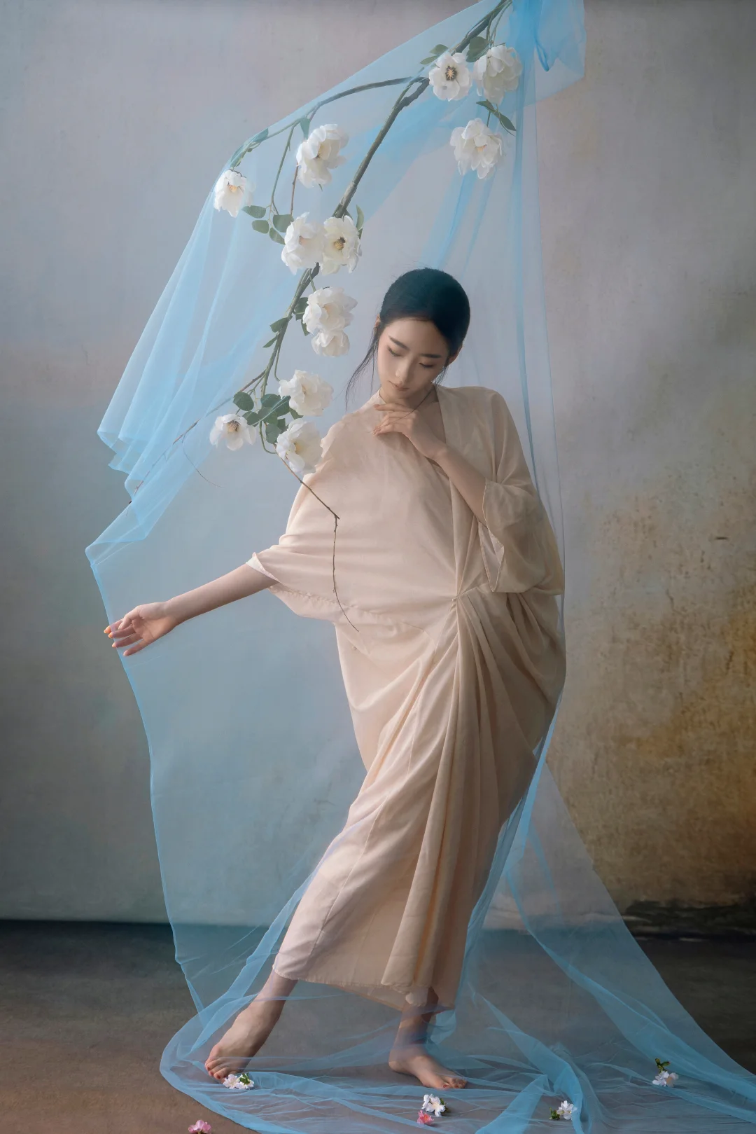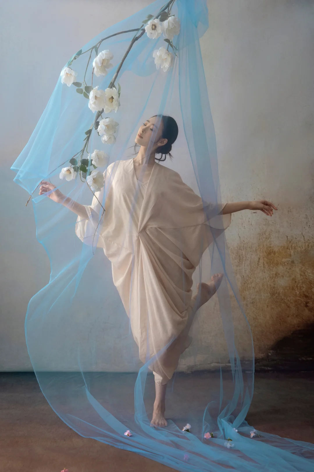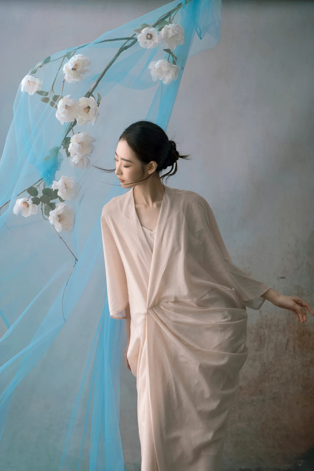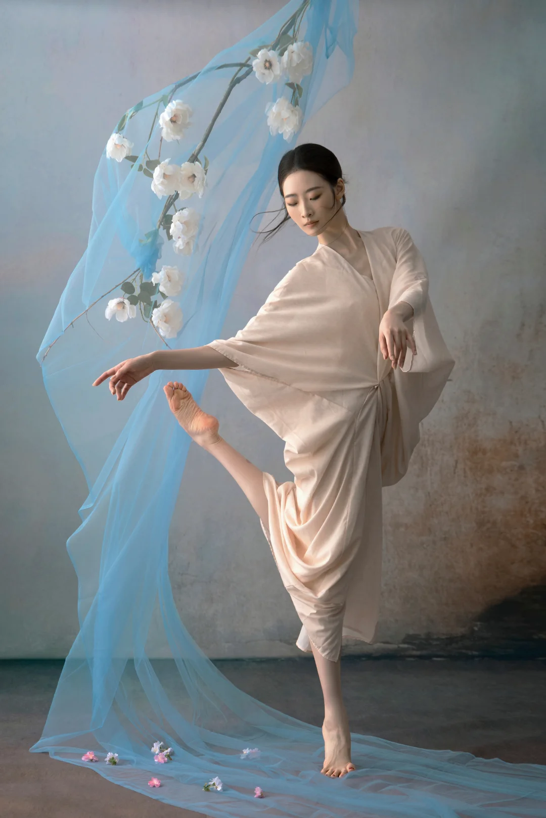 淡杏色的棉麻裙衬出舞者的温柔,冰蓝色的纱幔像把春日的风都揉进了镜头里,搭配山茶花的点缀,氛围感直接拉满!