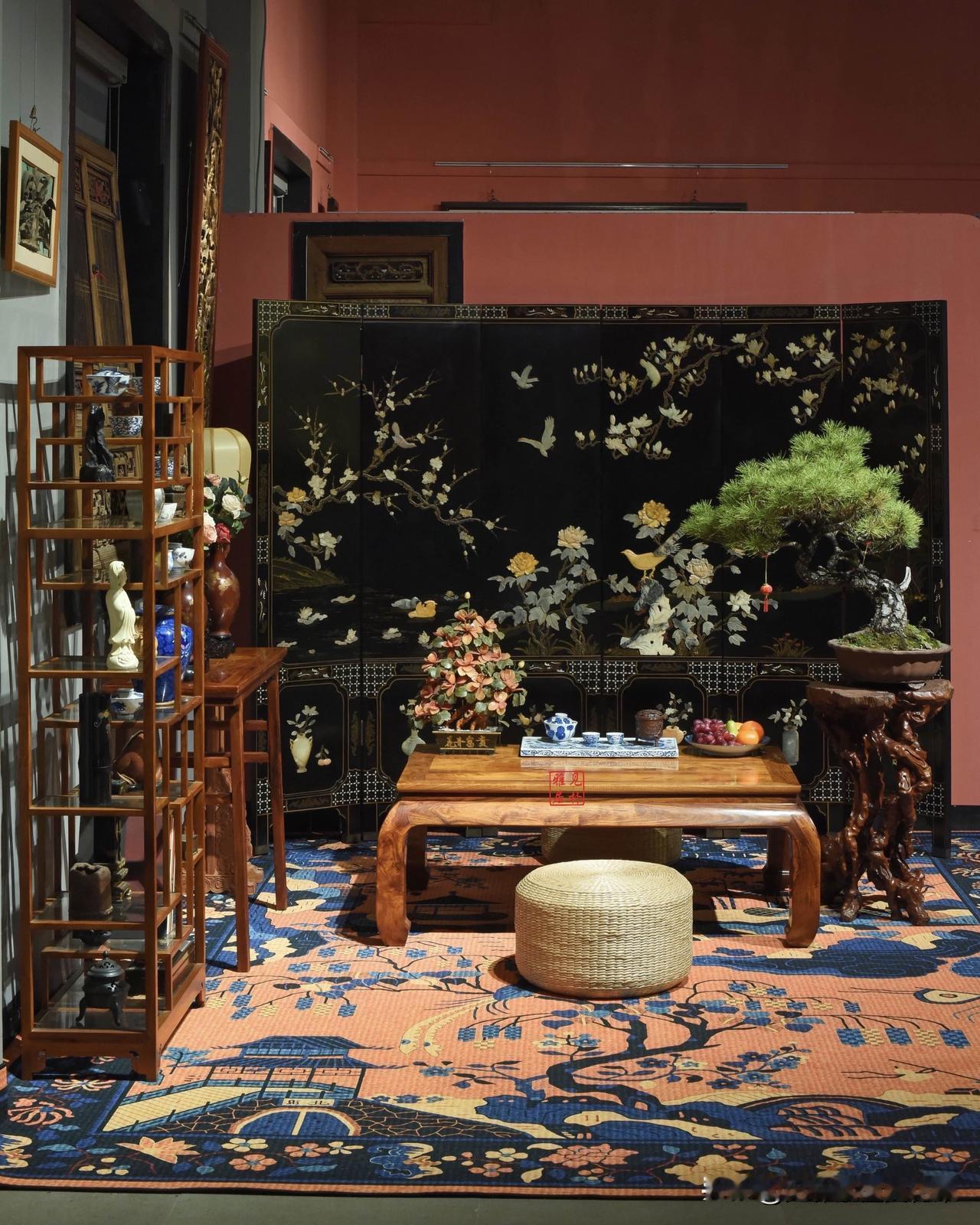 一张老木桌,两只蒲团,案上有花,架上有物,屏风绘着花鸟,盆景藏着山野。