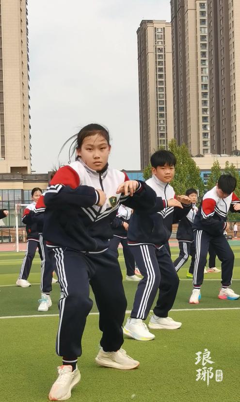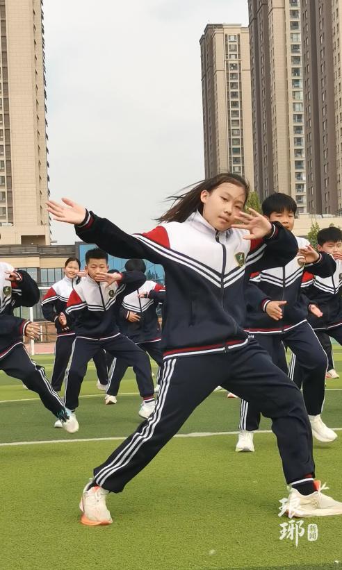 4月14日下午,记者在现场看到,春日的校园里阳光正好,微风拂面,一群身着校服的孩子正随着动感的音乐尽情舞动,舞步轻盈利落,动作整齐划一,脸上洋溢着自信的笑容,满是朝气蓬勃的少年气息,现场氛围感直接拉满。