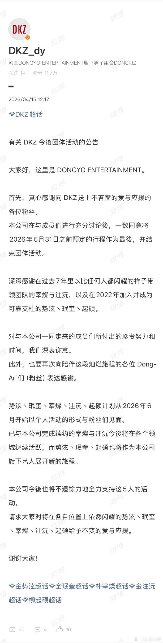 DKZ官宣解散 将活动到5月31日为止并解散进行个人活动 。