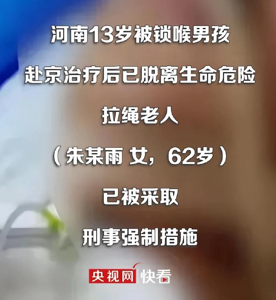 河南锁喉拉绳老太太,抓到了,朱某雨,62岁,已被采取刑事强制措施,不一定刑事拘留,涉嫌犯罪,在配合接受刑事调查,老太为了打玉米拉围绳围起来,不是故意要害人,就看伤情程度了,如果重伤,很可能就是过失致人重伤罪,否则就没多大啥事,民事赔偿钱就行了,一个小细节造成这么大事故,警示每一个人,不要在任何地方私自拉绳!!!
