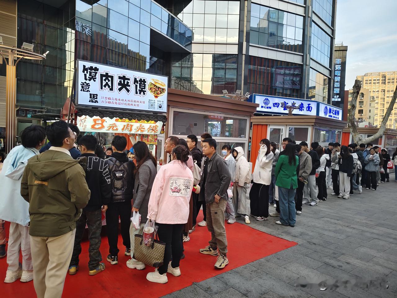 一个卖肉夹馍的,竟然排了近百米的队!路过李村步行街,发现很多人排成队,走上前一看